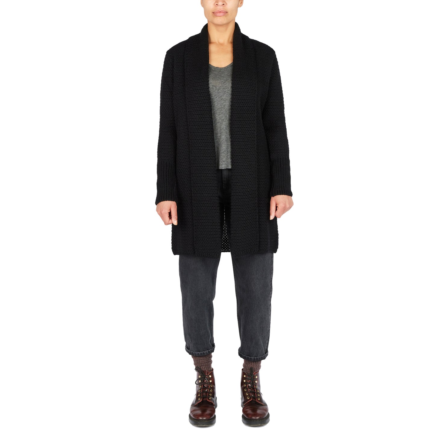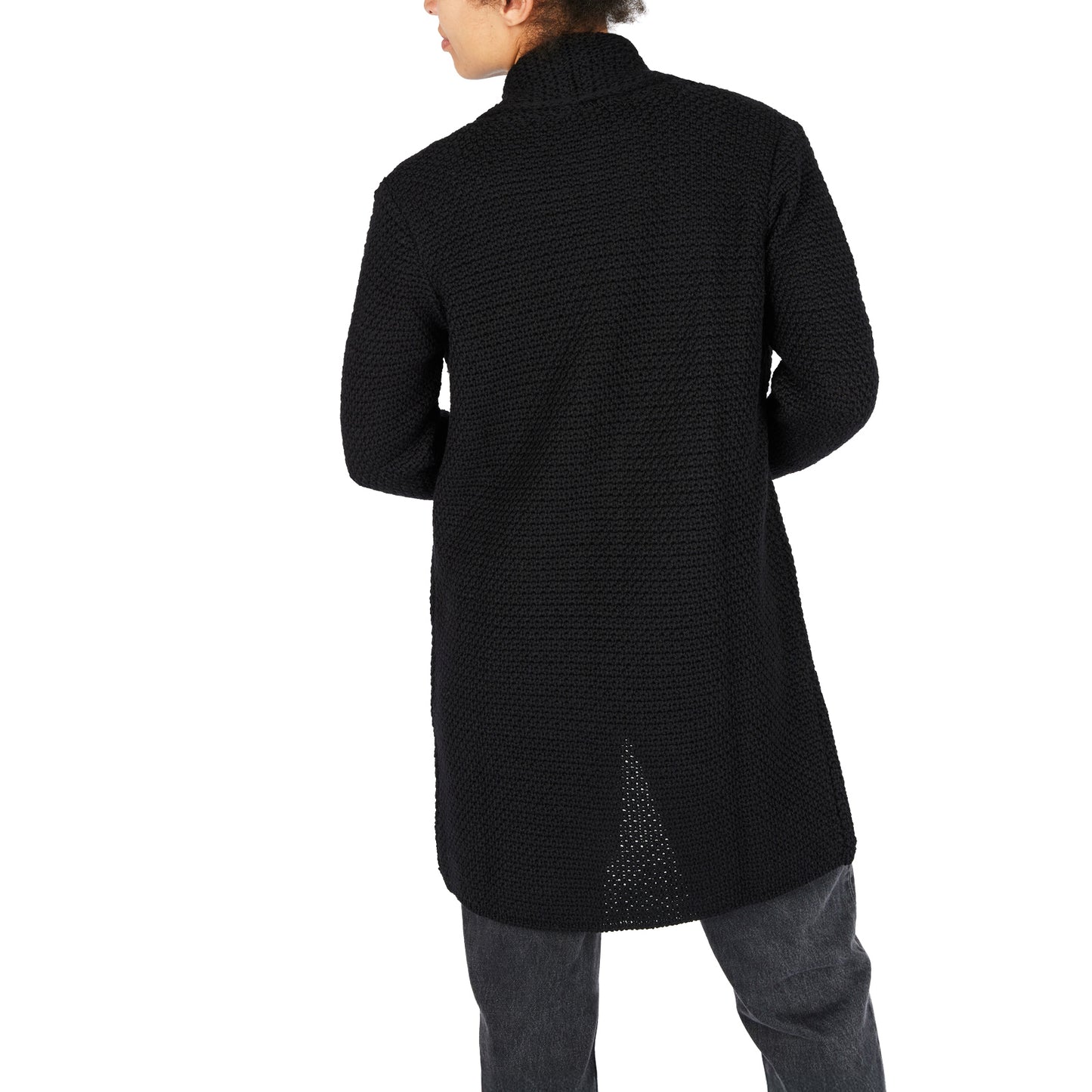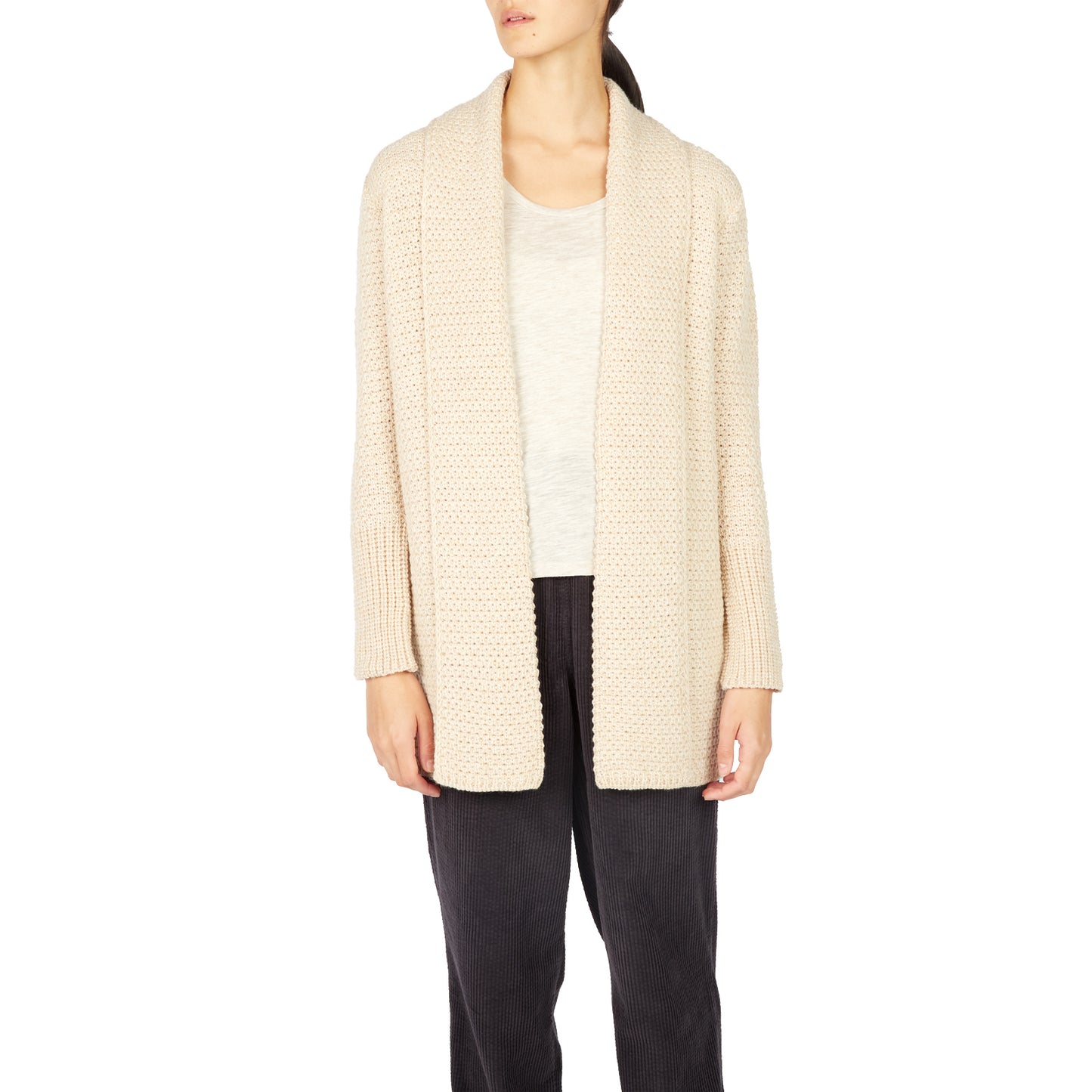 Gerade geschnittene, lange Schalkragenjacke aus Wolle in beige, blau, blau meliert und grau meliert. Besondere Optik durch lange Ärmelbündchen und interessantes Strickmuster.