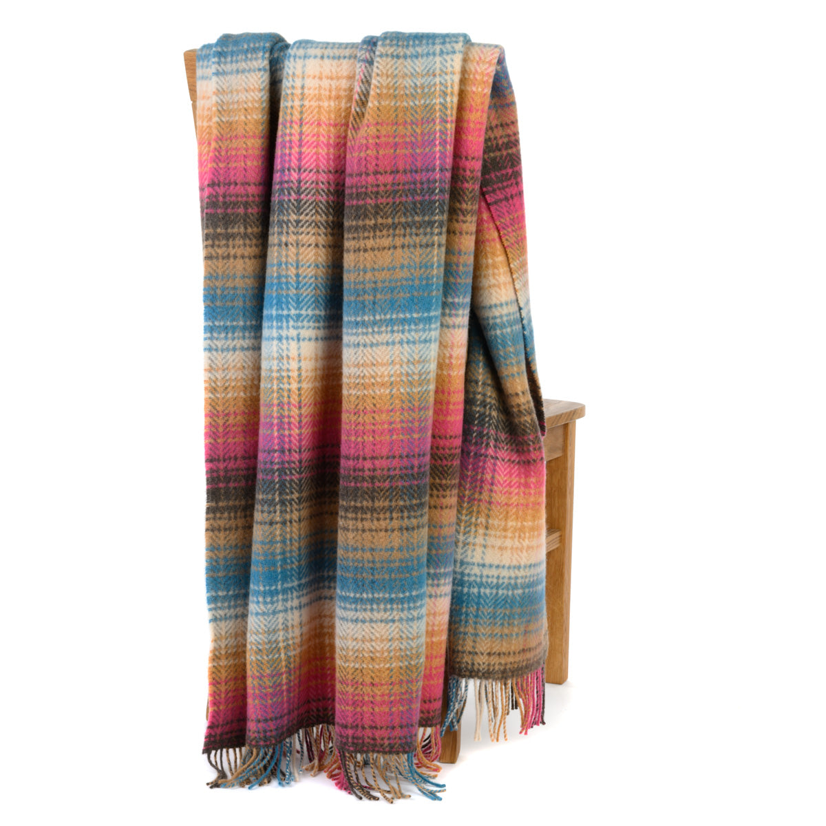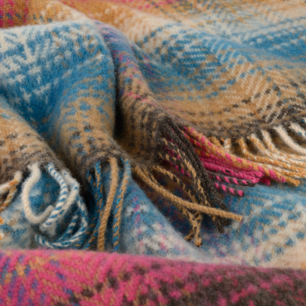 Tolle bunte Decke, gut passend zu einem braunen, sandfarbenen oder beigen Sofa. Aufgrund der Materialien (Merinowolle und Kaschmir) ist diese Decke besonders weich und lädt immer wieder zum Kuscheln ein.