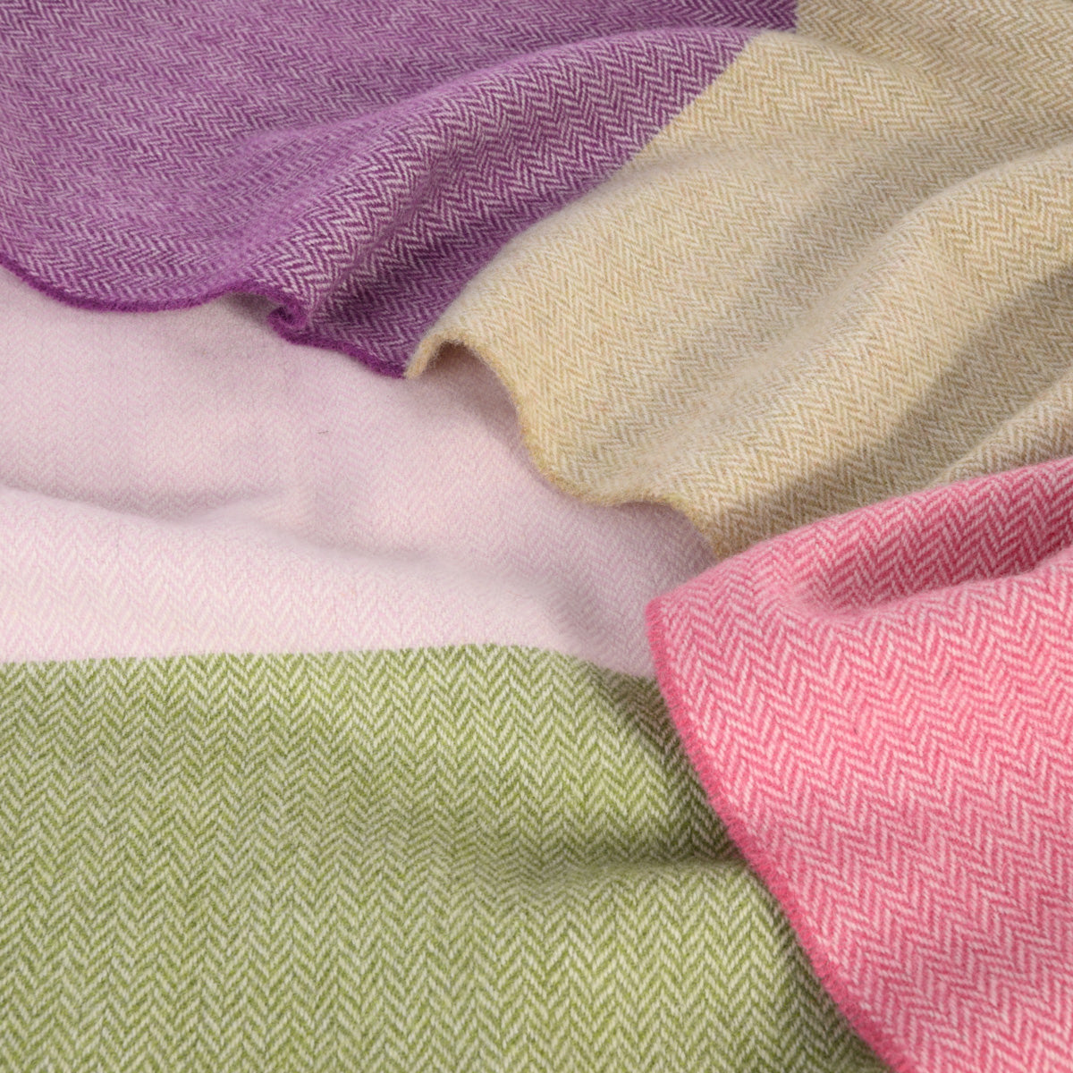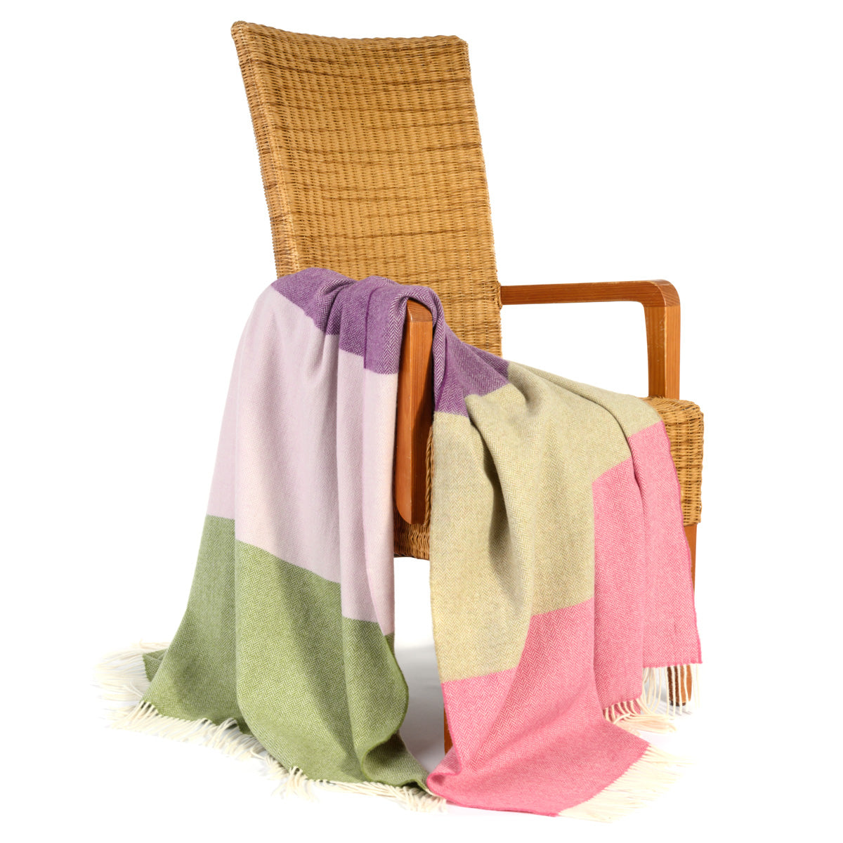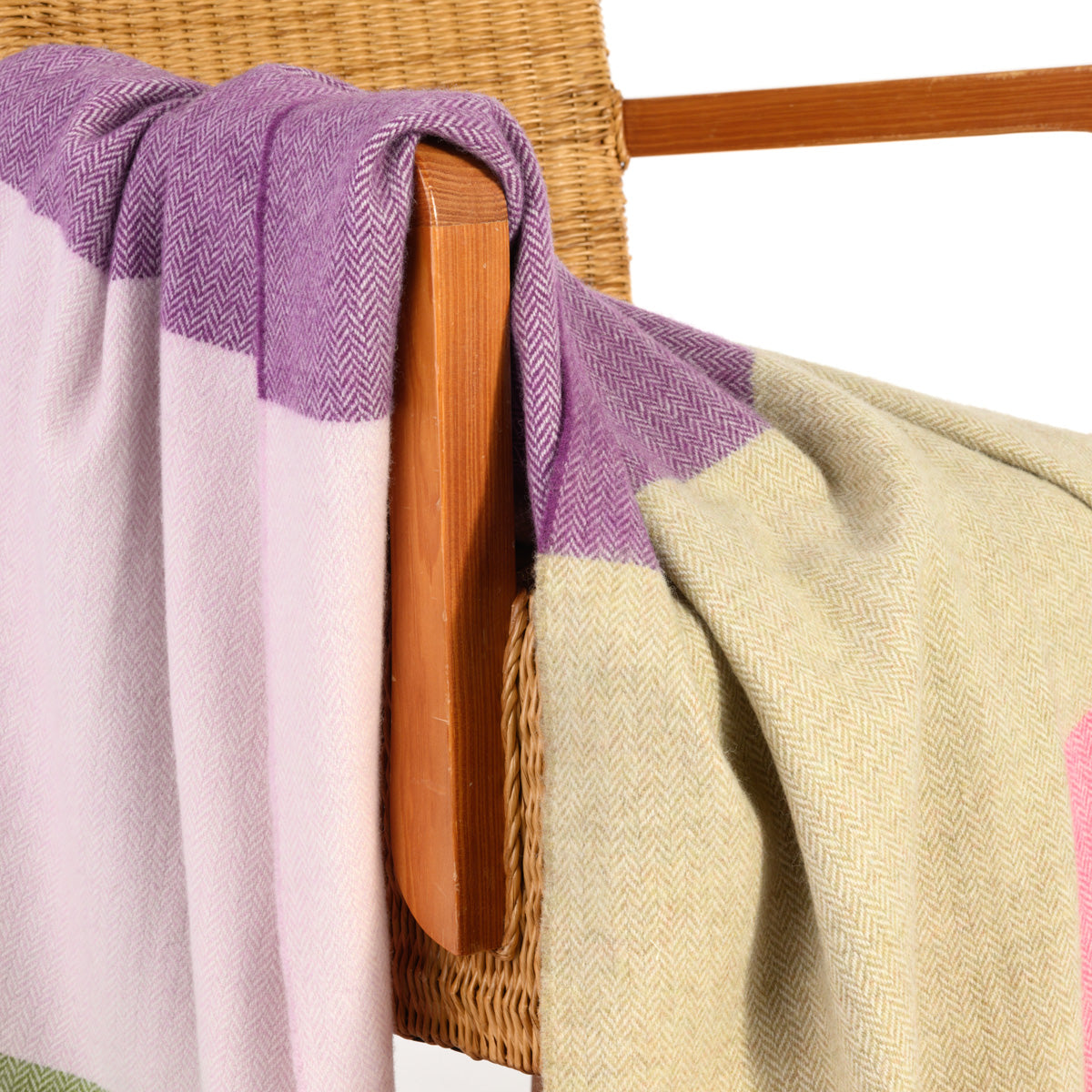 Bunte Farben machen diese Decke zu einem lebendigen Blickfang. Sie ist leicht, kuschelig und aus 100 % Lammwolle gefertigt. Ideal, um dem Wohnraum Frische zu geben oder für wohltuende Wärme im Alltag. Ca. 150 x 200 cm, mit feinem Fischgätmuster in einem farbenfrohen Blockdesign, Lila, Rosa und Grün.
