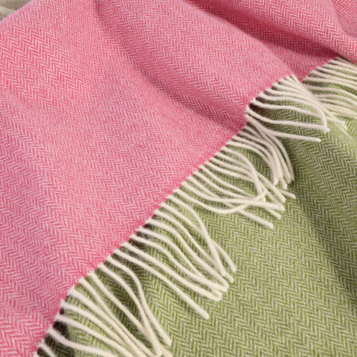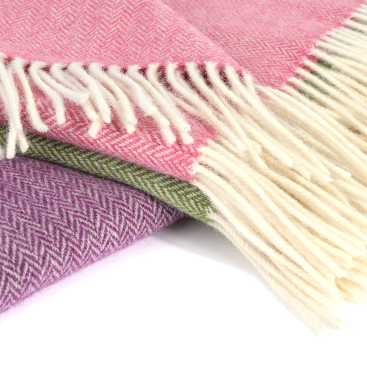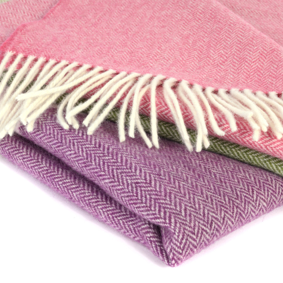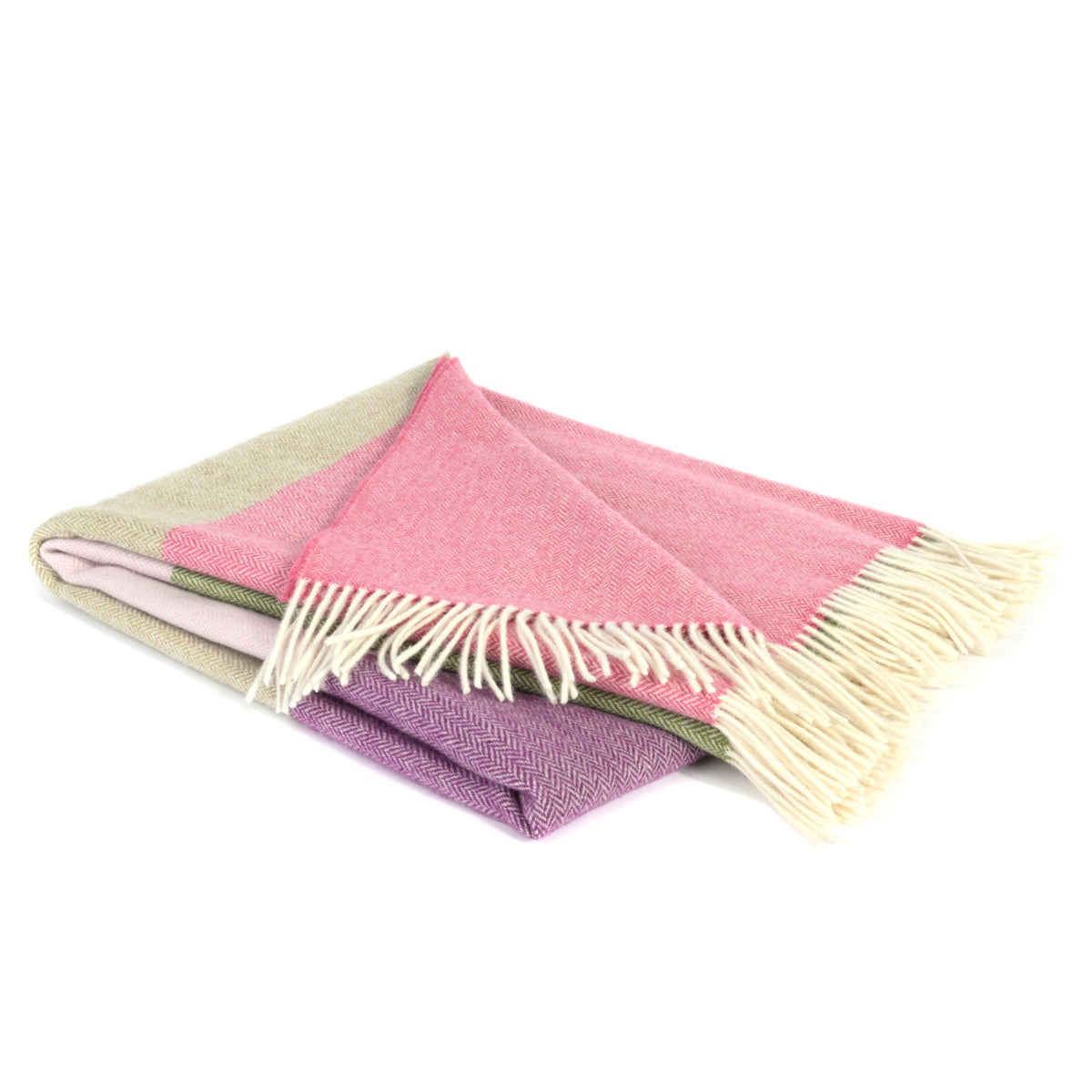 Bunte Farben machen diese Decke zu einem lebendigen Blickfang. Sie ist leicht, kuschelig und aus 100 % Lammwolle gefertigt. Ideal, um dem Wohnraum Frische zu geben oder für wohltuende Wärme im Alltag. Ca. 150 x 200 cm, mit feinem Fischgätmuster in einem farbenfrohen Blockdesign, Lila, Rosa und Grün.