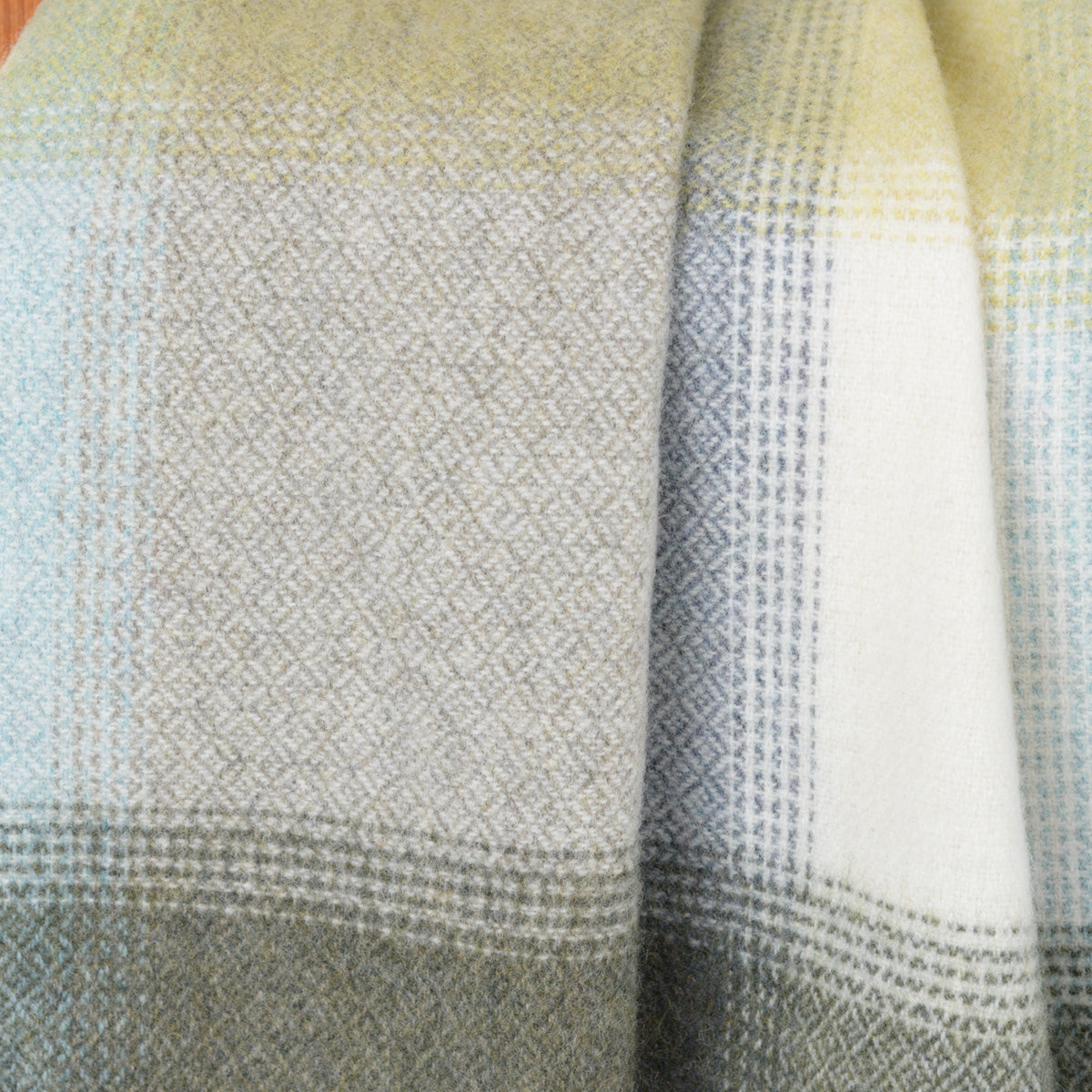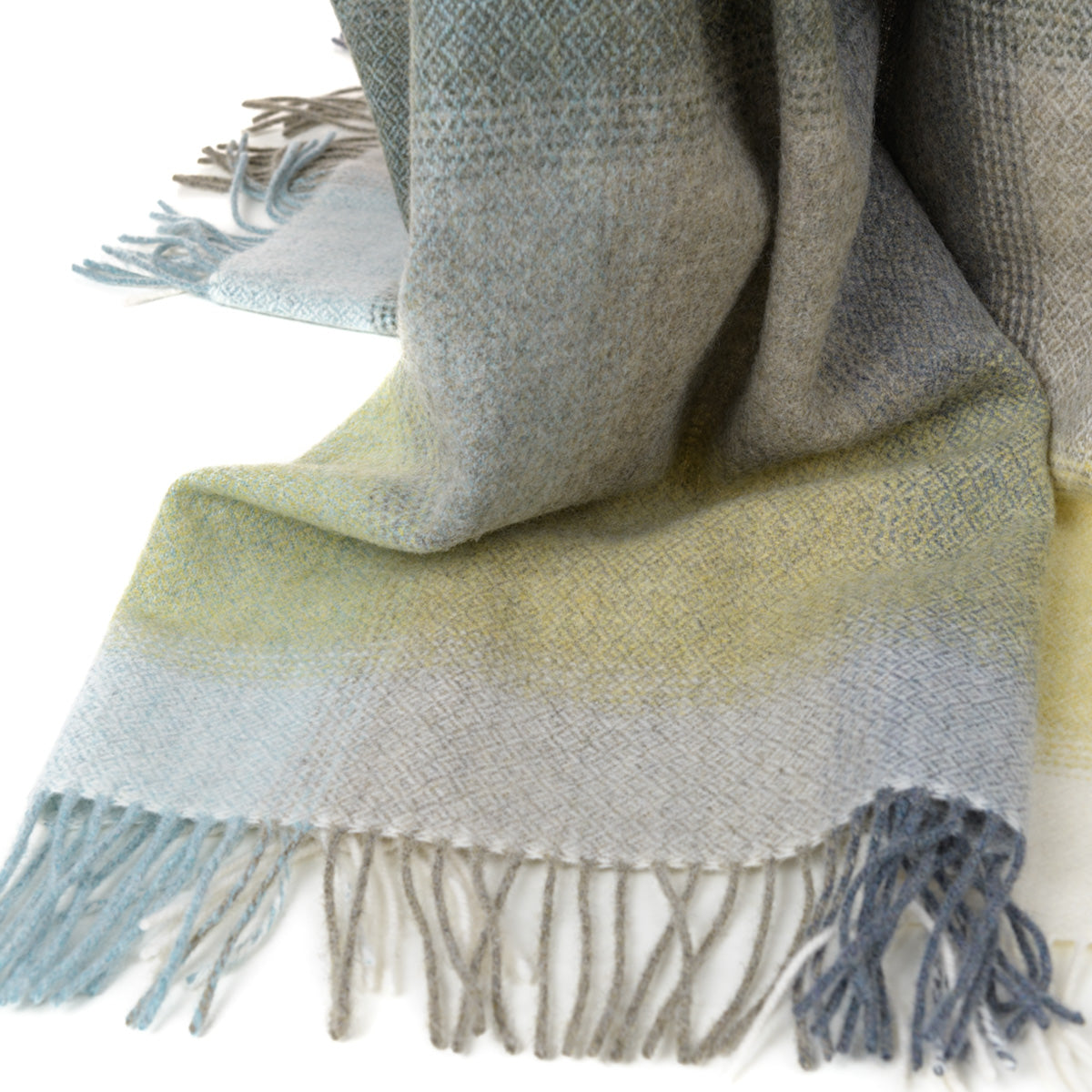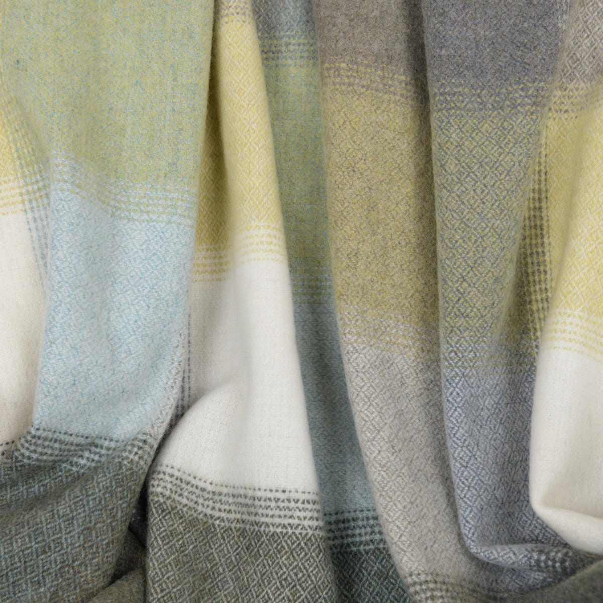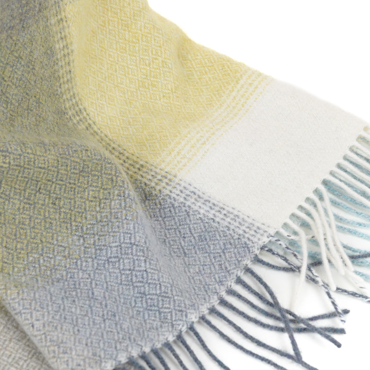 Extra große Lammwolldecke aus Merino-Lammwolle besticht durch ihr klassisches Karomuster, das mit einem feinen Diamantenmuster durchzogen ist. Mit einer gelungenen Farbmischung aus Grün, Grau und Gelb ist die Decke leichtgewichtig und fein gewebt. Sie stammt aus der Werkstatt des Meisterwebers John Hanly.