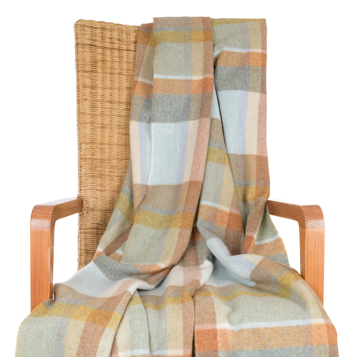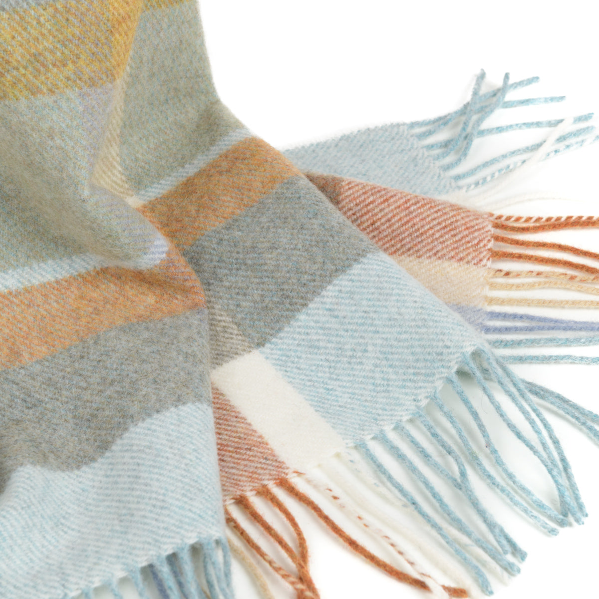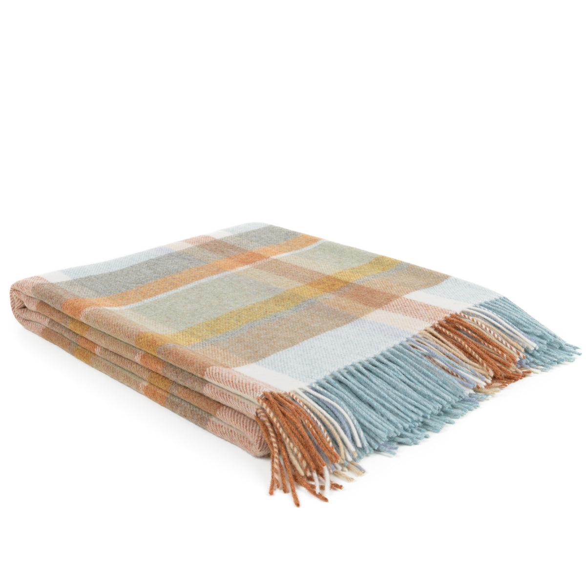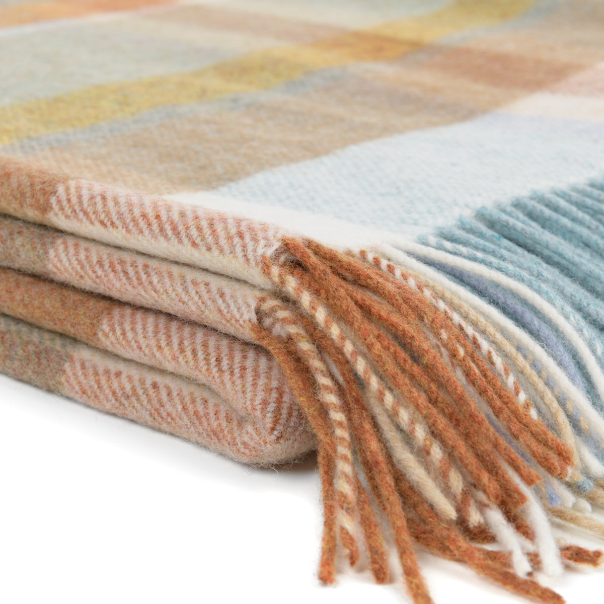 Feine Merino-Lambswooldecke mit einem großzügigen Maß von 150 x 200 cm! Eine tolle, sehr frische Farbkombination aus unzähligen, bunten Rechtecken in einem Kreuzmuster. Eine qualitativ sehr hochwertige, warme und weiche Wolldecke.