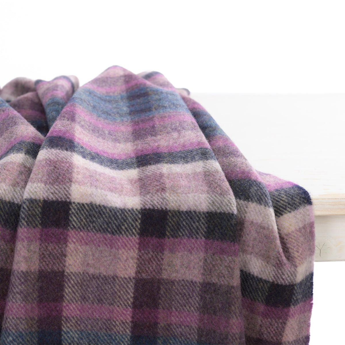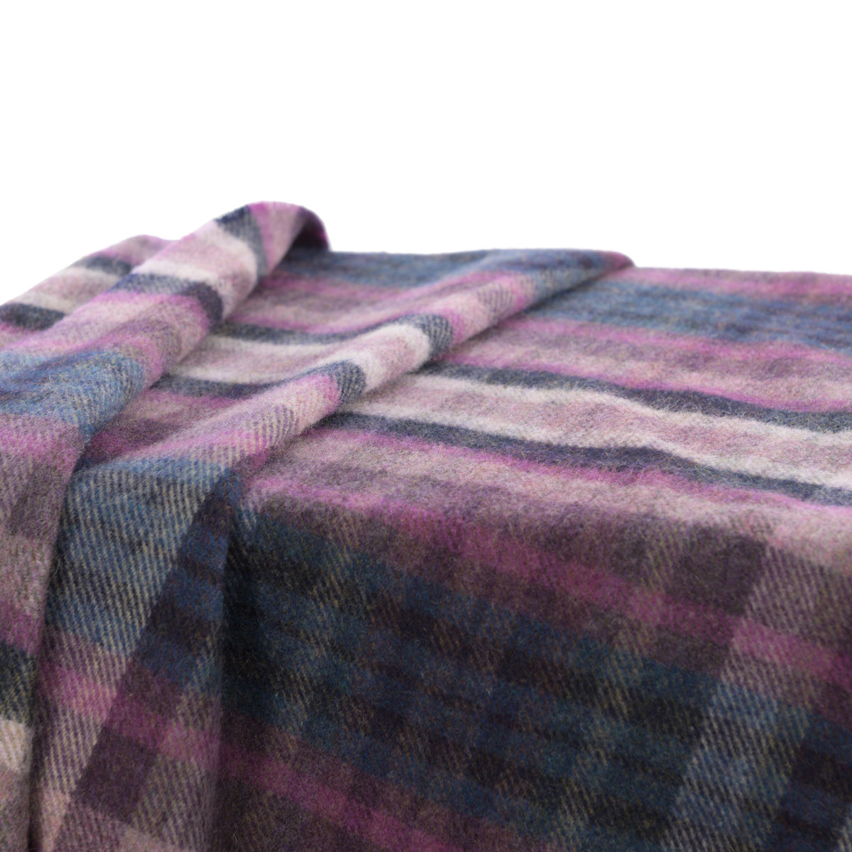 Eine leichtgewichtige, fein gewebte Lammwolldecke mit klassischem Karomuster in Lila, Blau und Flieder. Die bunte Decke wurde in Irland aus hochwertiger Merino-Wolle hergestellt.
