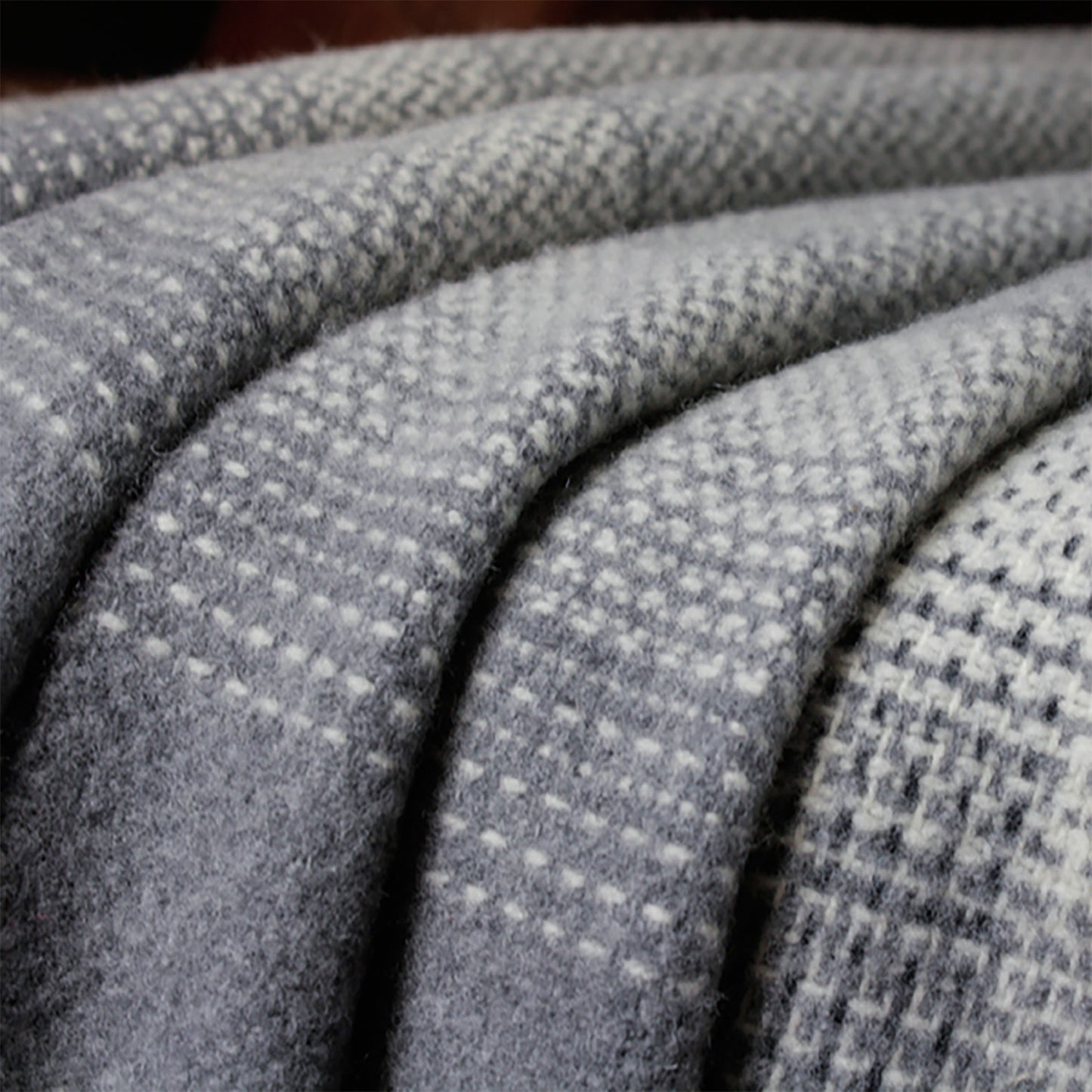 Eine Wolldecke aus Kaschmir und feiner Merino-Schurwolle, schön warm und weich! Diese Decke ist etwas ganz Besonderes. Sie hat ein wunderschönes Muster. Der Rand der Decke (ca. 30 – 40 cm) zeigt verschiedene schöne Streifenmuster, die „Innenfläche“ ist beruhigend in naturfarbenem und grauem Design. Ein Qualitätsprodukt der irischen Weberei „John Hanly“.