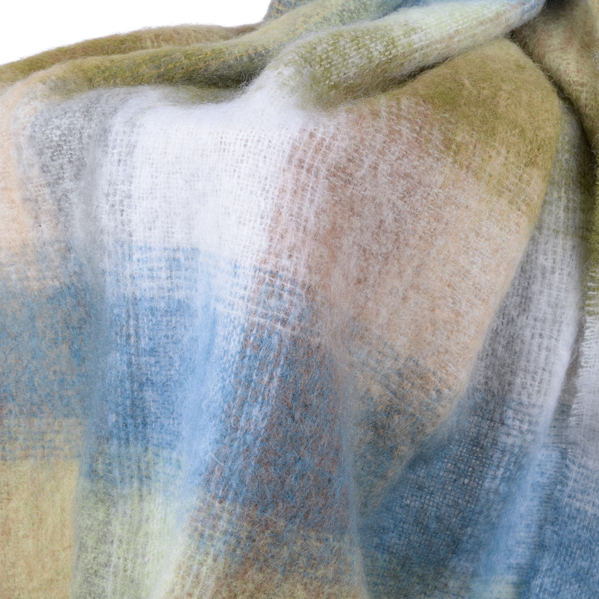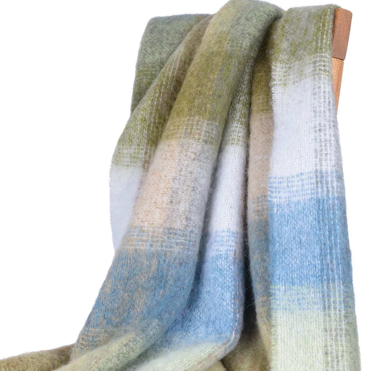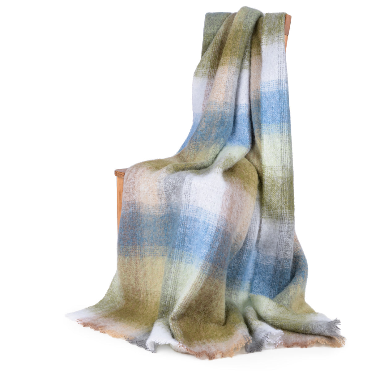 Diese herrliche Decke stammt aus Irland und ist aus 70% Mohair und 30% Wolle gefertigt. Sie ist von auffälligen Hellblautönen durchzogen und fühlt sich unglaublich weich an. Die Verwendung von erstklassigem Mohairgarn sorgt für ein flauschiges Gewebe, das wunderschön fällt und eine hervorragende Wärmeisolierung bietet. Diese kuschelige Decke ist von exquisiter Markenqualität und verfügt an beiden Seiten über interessante Abschlüsse aus kurzen Einzelfäden. Sie wurde von der renommierten irischen Weberei "John Hanly" entworfen und gefertigt, die seit 1893 für höchste Qualität und Verarbeitung steht. Ob als persönliche Belohnung oder als Geschenk für besondere Menschen - diese Decke ist eine großartige Wahl!