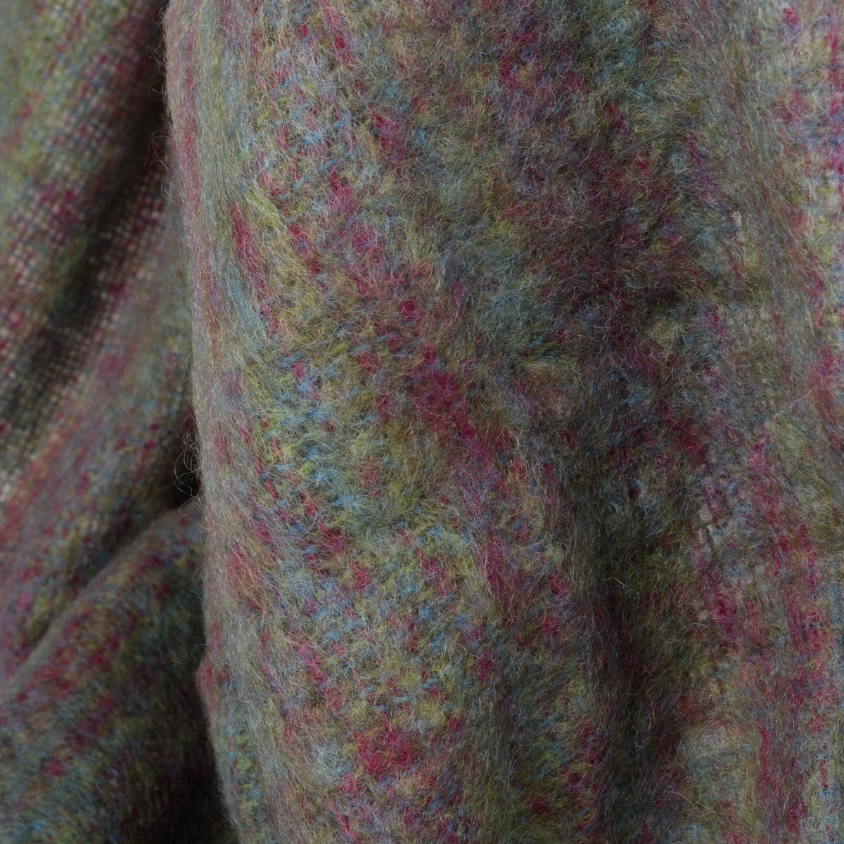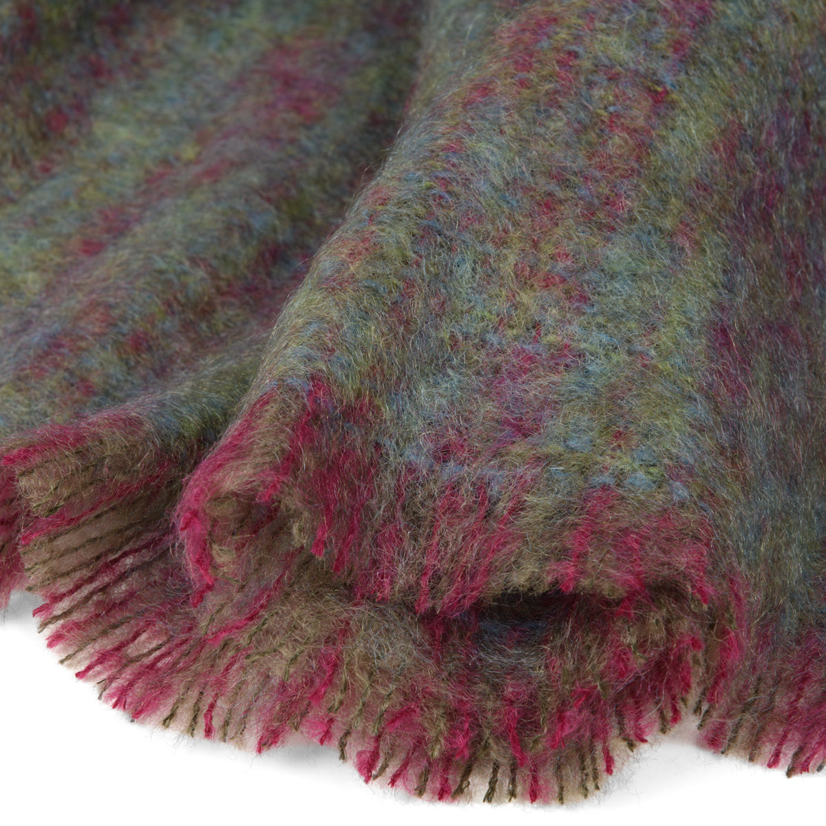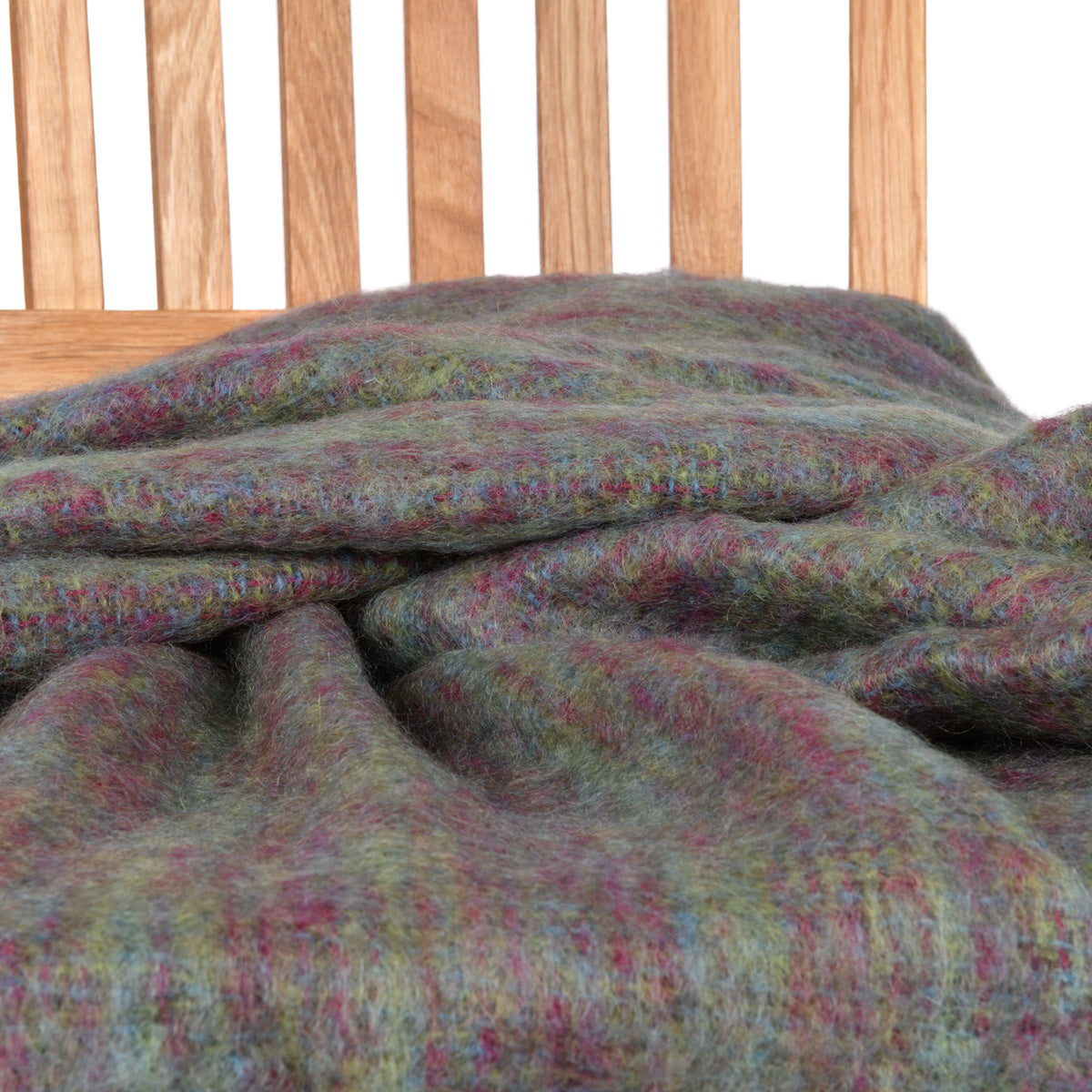 In dieser Mohairdecke von John Hanly findet sich eine tolle Farbmischung. Die unterschiedlichen Grün- sowie einige Blautöne verschmelzen mit den rhabarberfarbenen Webfäden und wirken insgesamt äußerst gemütlich. Eine herrliche Wolldecke!