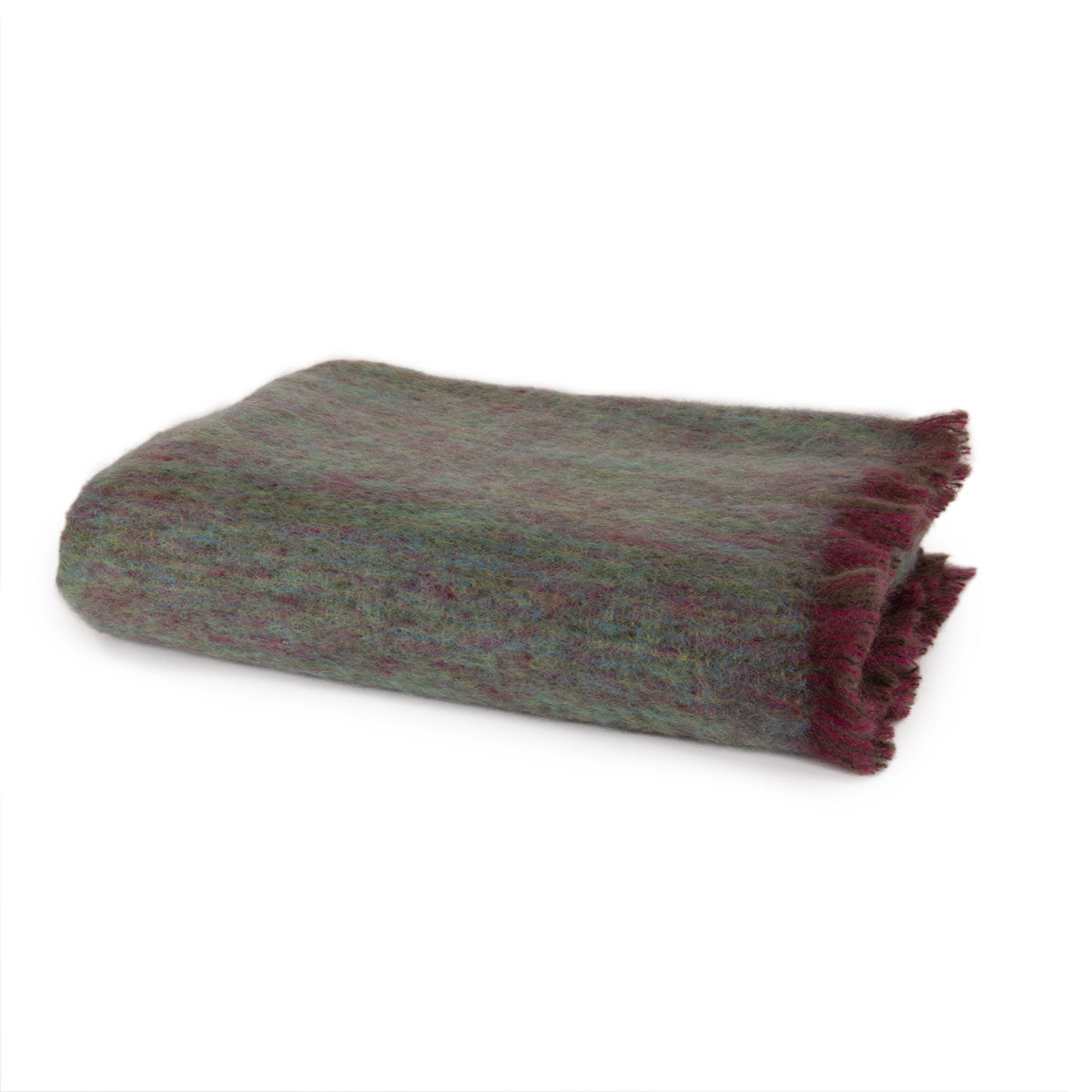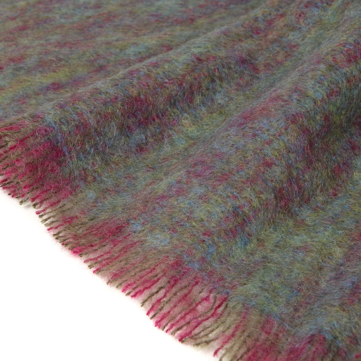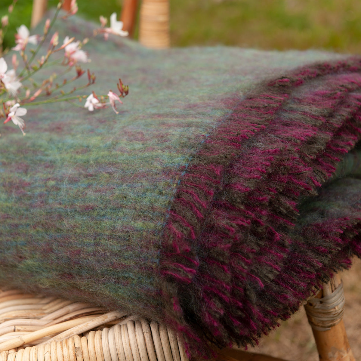 In dieser Mohairdecke von John Hanly findet sich eine tolle Farbmischung. Die unterschiedlichen Grün- sowie einige Blautöne verschmelzen mit den rhabarberfarbenen Webfäden und wirken insgesamt äußerst gemütlich. Eine herrliche Wolldecke!