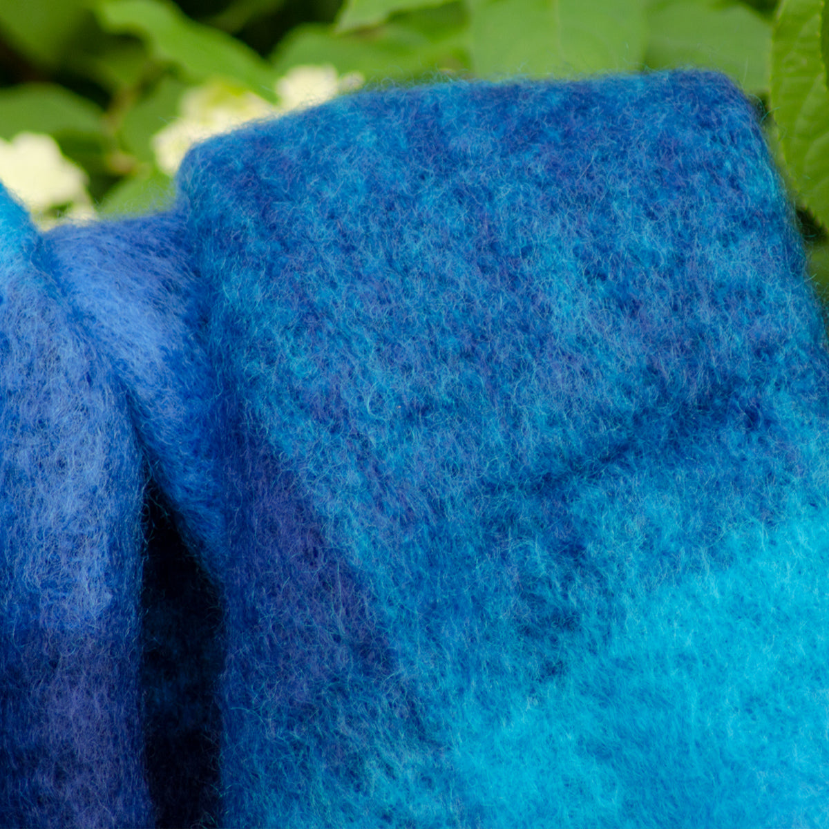 Diese Mohairdecke mit blauen Karos ist sooo kuschelig! Das flauschige Gewebe wärmt durch die feine Webart besonders gut.