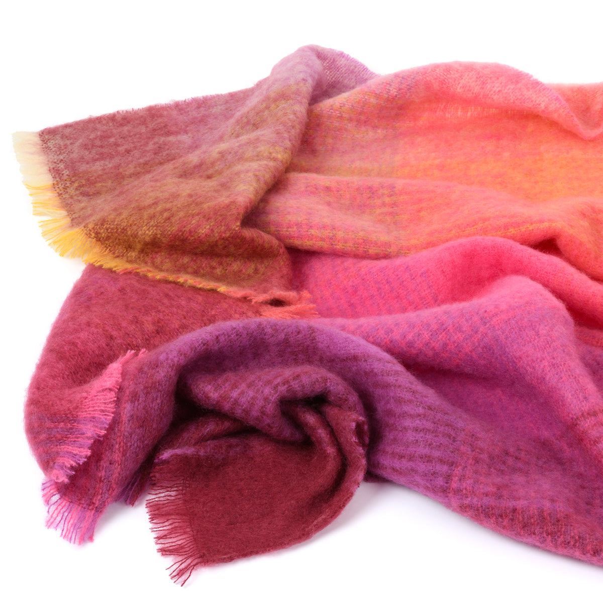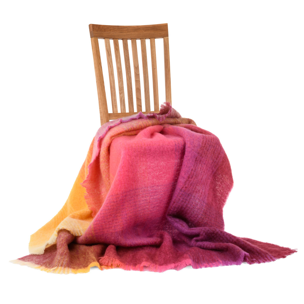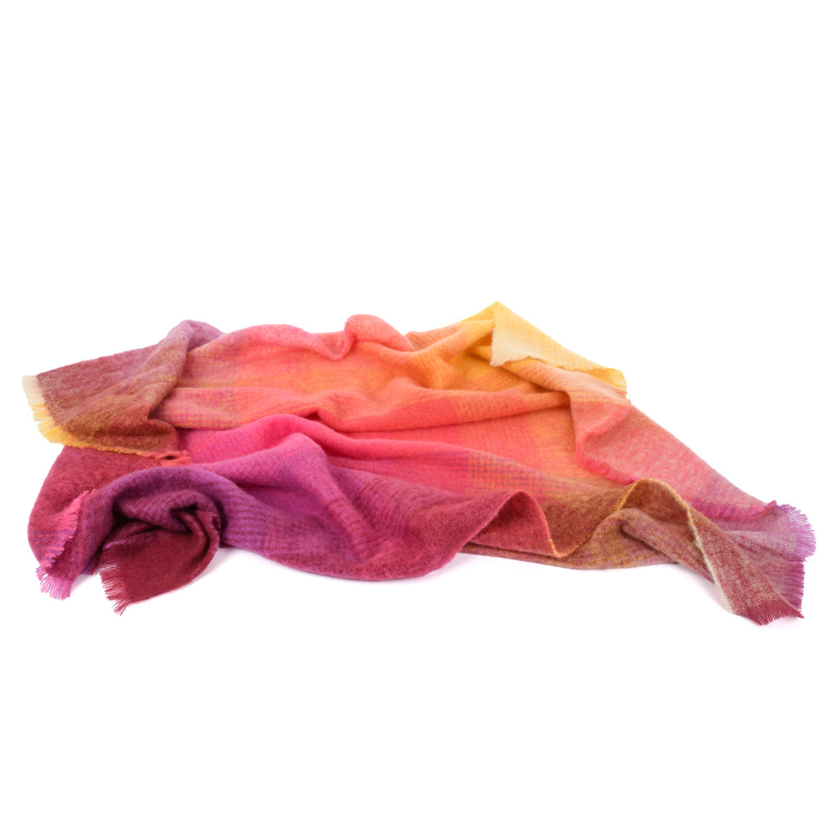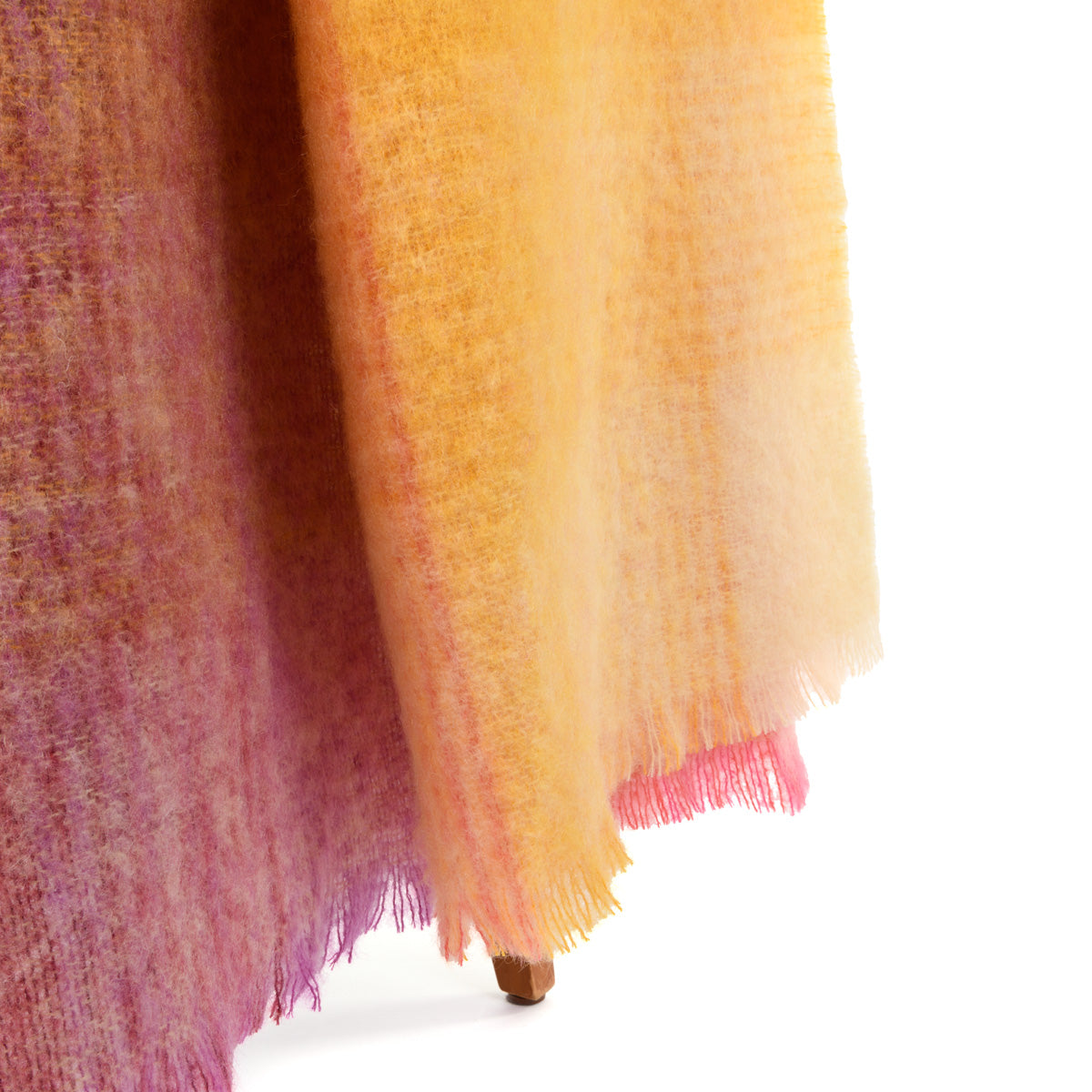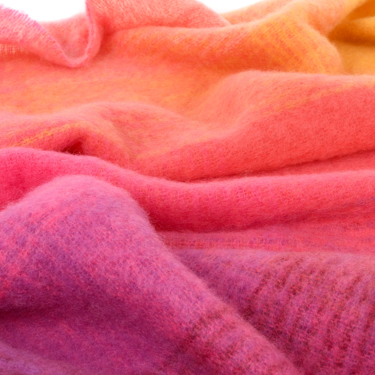 Mit dem farbenfrohen Farbverlauf, der von sanften Gelb- und Orangetönen zu lebendigem Pink übergeht, strahlt dieses Mohairplaid eine einzigartige Energie aus, die Ihr Zuhause beleben wird. Verleihen Sie Ihrem Zuhause mit dieser farbenfrohen Mohair-Wolldecke von John Hanly einen Hauch von Eleganz und Luxus. Genießen Sie den zarten Farbverlauf und die unvergleichliche Weichheit, während Sie sich in den Komfort dieser einzigartigen Decke hüllen.