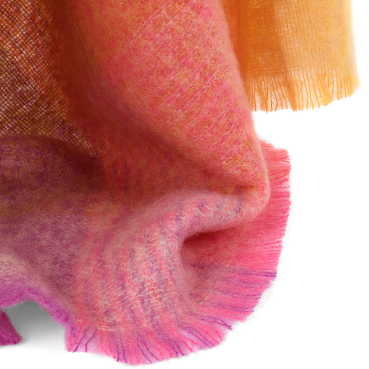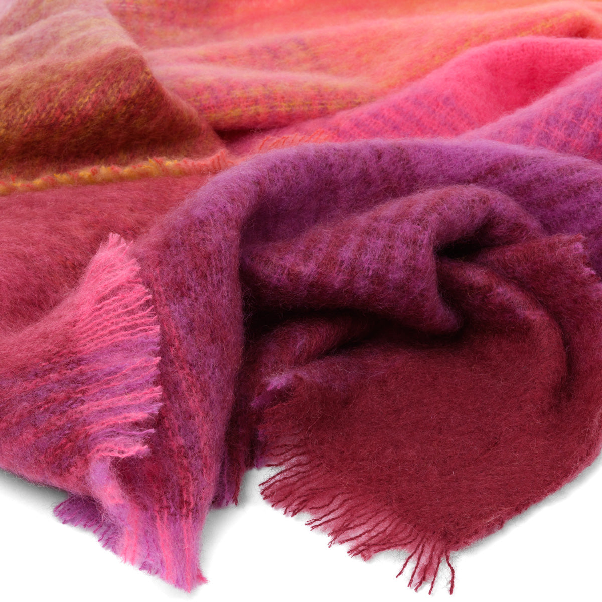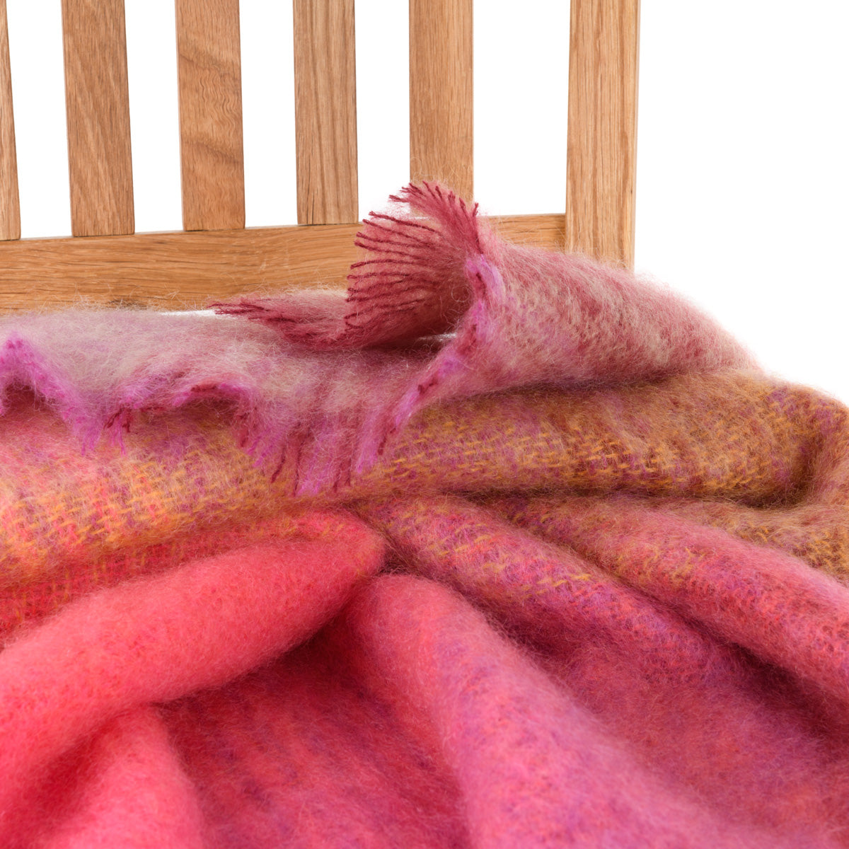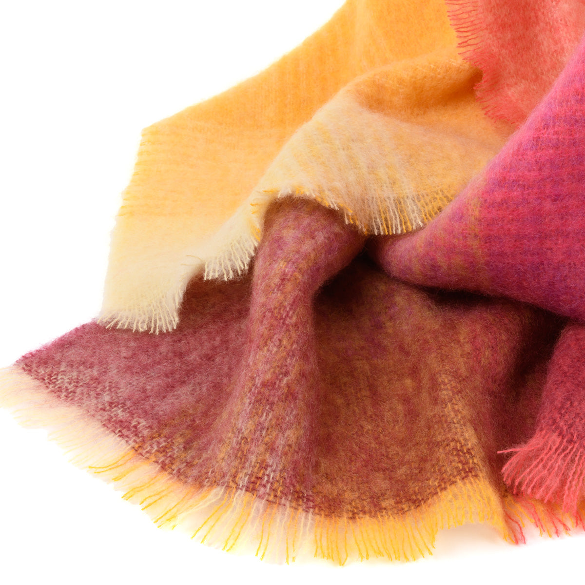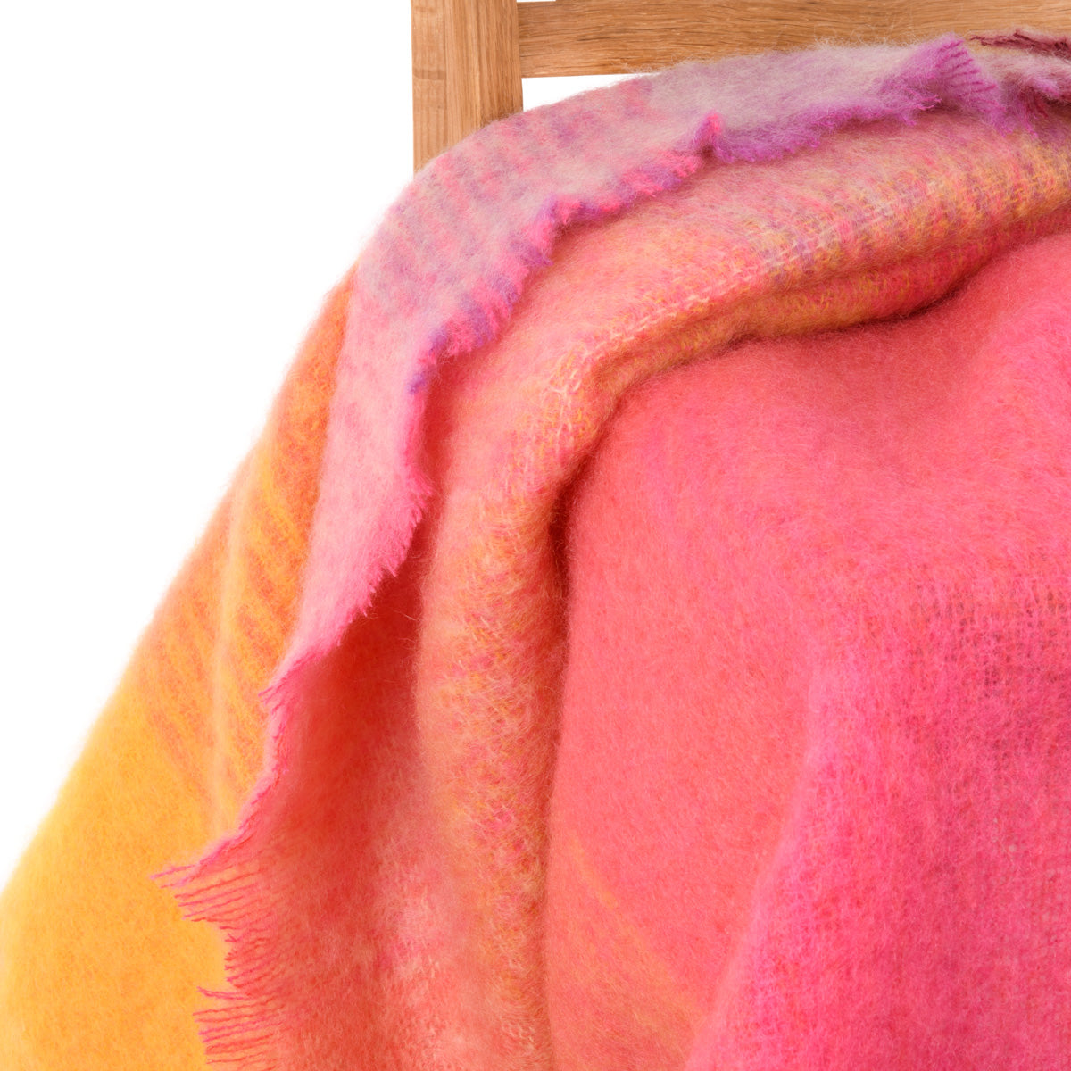 Mit dem farbenfrohen Farbverlauf, der von sanften Gelb- und Orangetönen zu lebendigem Pink übergeht, strahlt dieses Mohairplaid eine einzigartige Energie aus, die Ihr Zuhause beleben wird. Verleihen Sie Ihrem Zuhause mit dieser farbenfrohen Mohair-Wolldecke von John Hanly einen Hauch von Eleganz und Luxus. Genießen Sie den zarten Farbverlauf und die unvergleichliche Weichheit, während Sie sich in den Komfort dieser einzigartigen Decke hüllen.