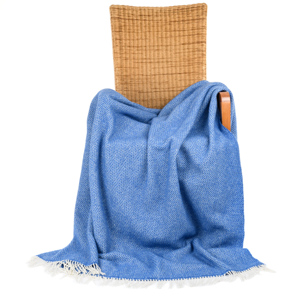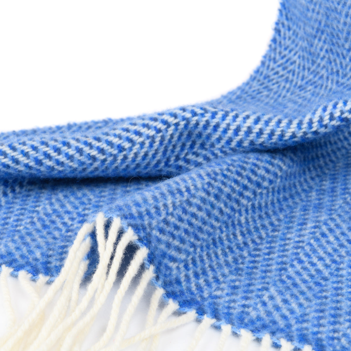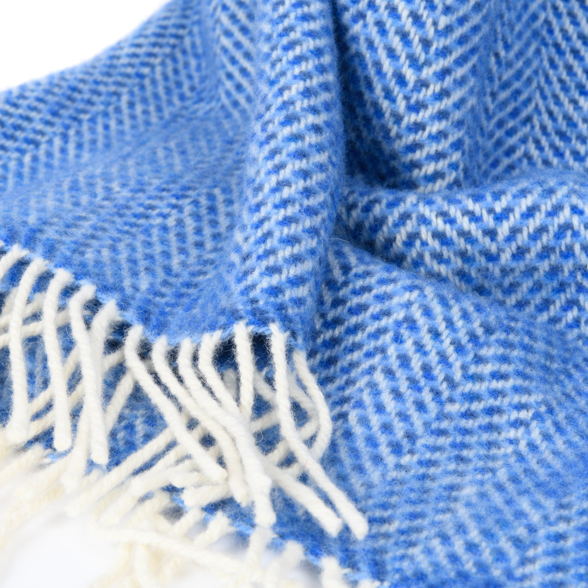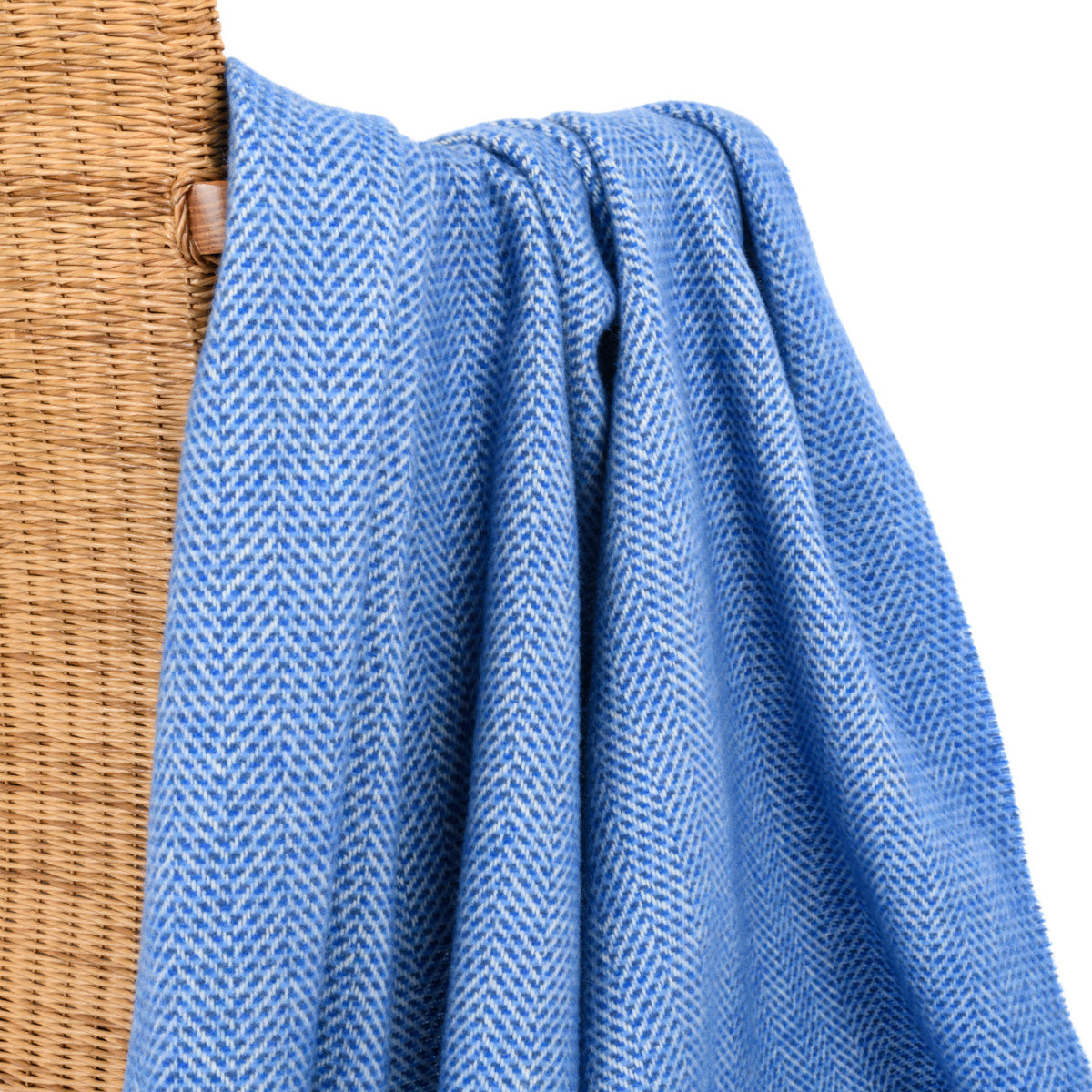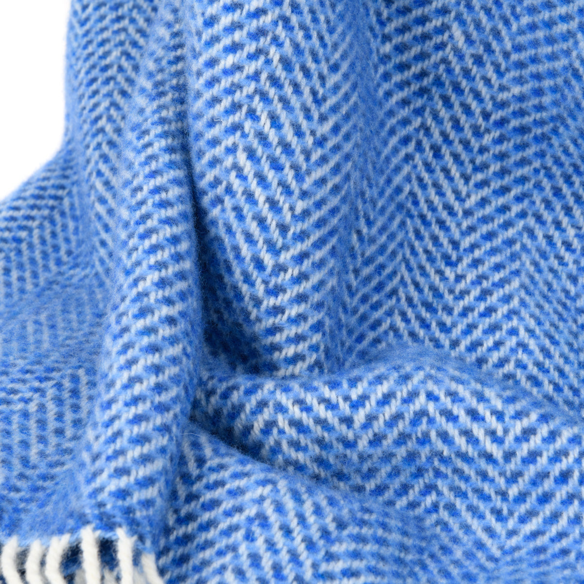 Leuchtend blau wie das Meer schillert diese kuschelige Wolldecke in drei Blautönen mit weißem Grundton. Eine gemütliche und luxuriöse Decke der Firma John Hanly aus Irland.