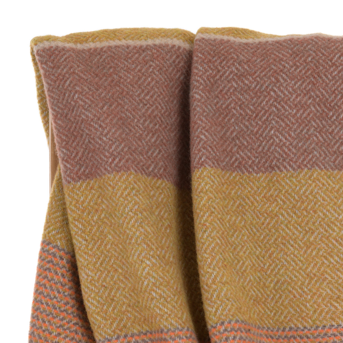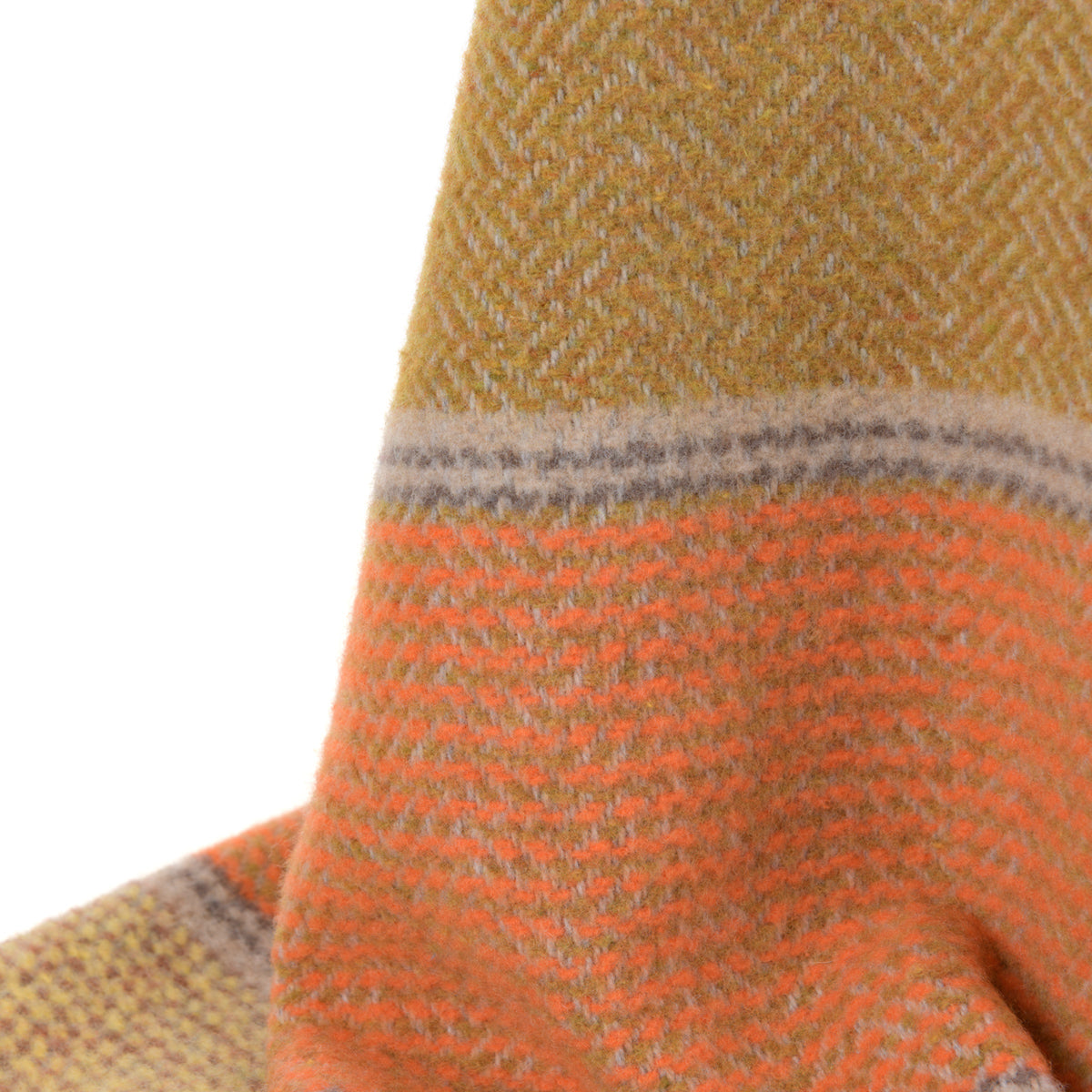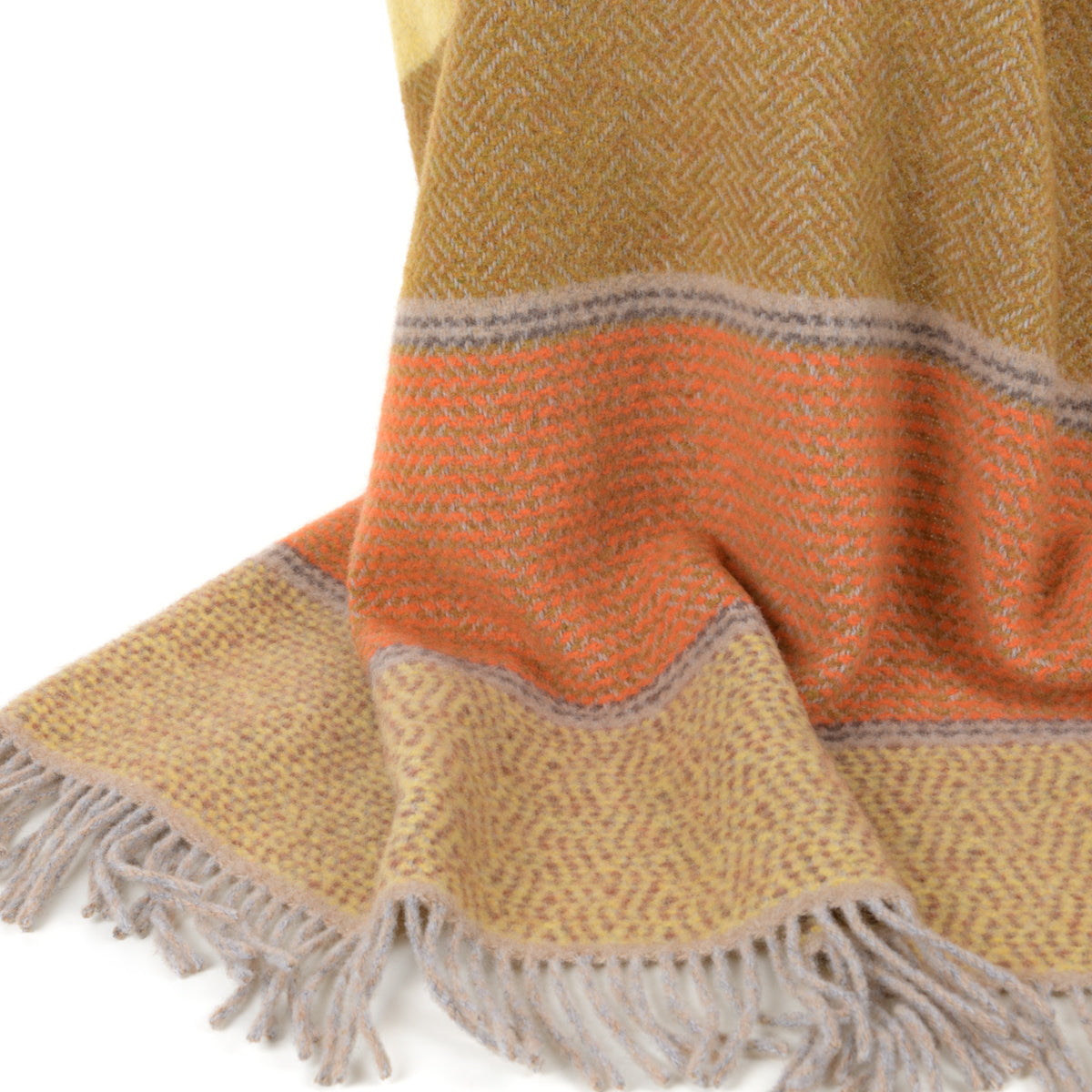 Diese Wolldecke, des renommierten irischen Textilherstellers John Hanly, ist mit auffälligen Streifen in den Farben Orange, Gelb, Braun und Karamell gewebt, die an die Farben des Spätsommers erinnern. Die kräftigen Farben und das ansprechende Muster machen die Decke zu einem Blickfang in jedem Raum. Sie besteht aus einer hochwertigen Mischung aus Merinowolle und einem Kaschmiranteil, was sie besonders weich und angenehm auf der Haut macht.