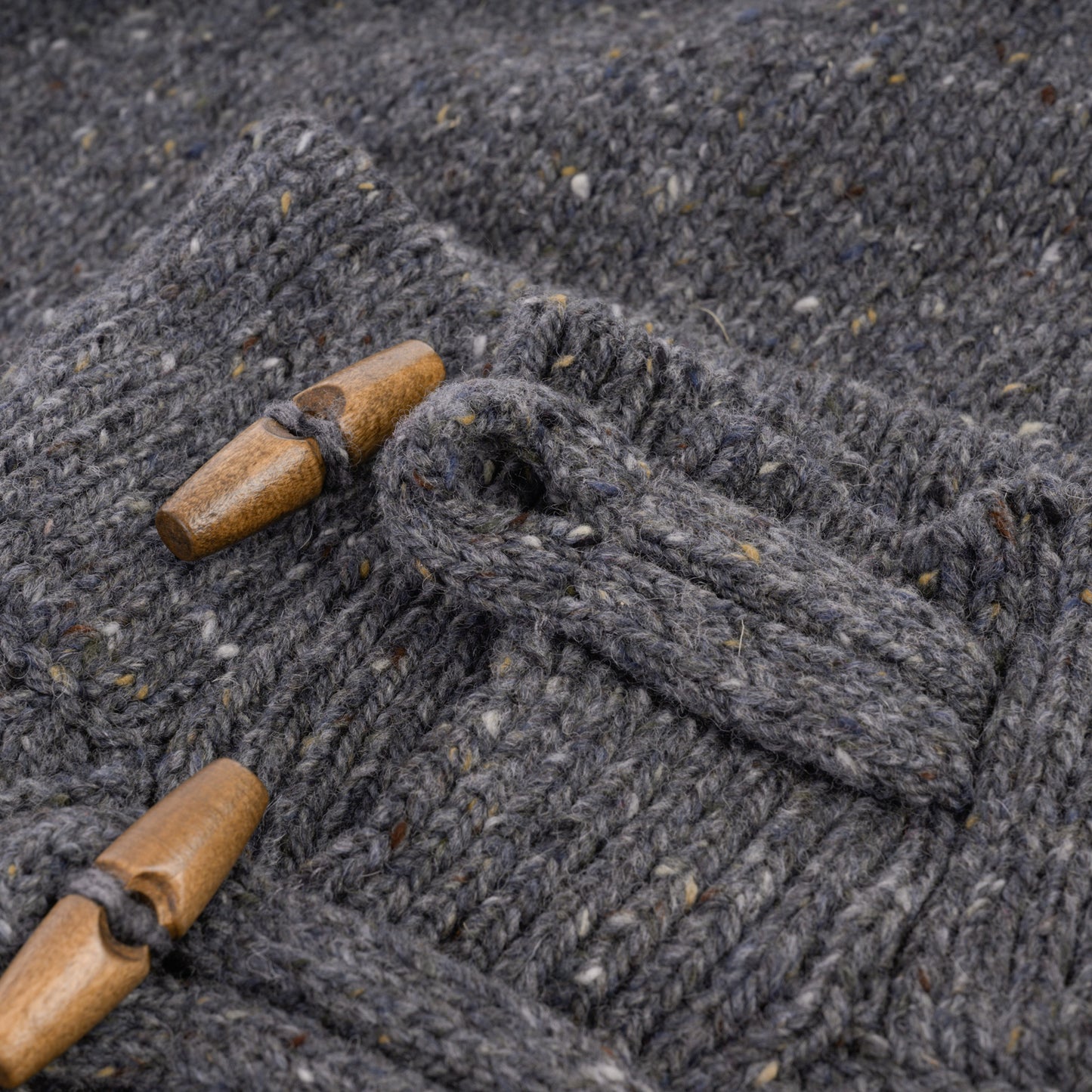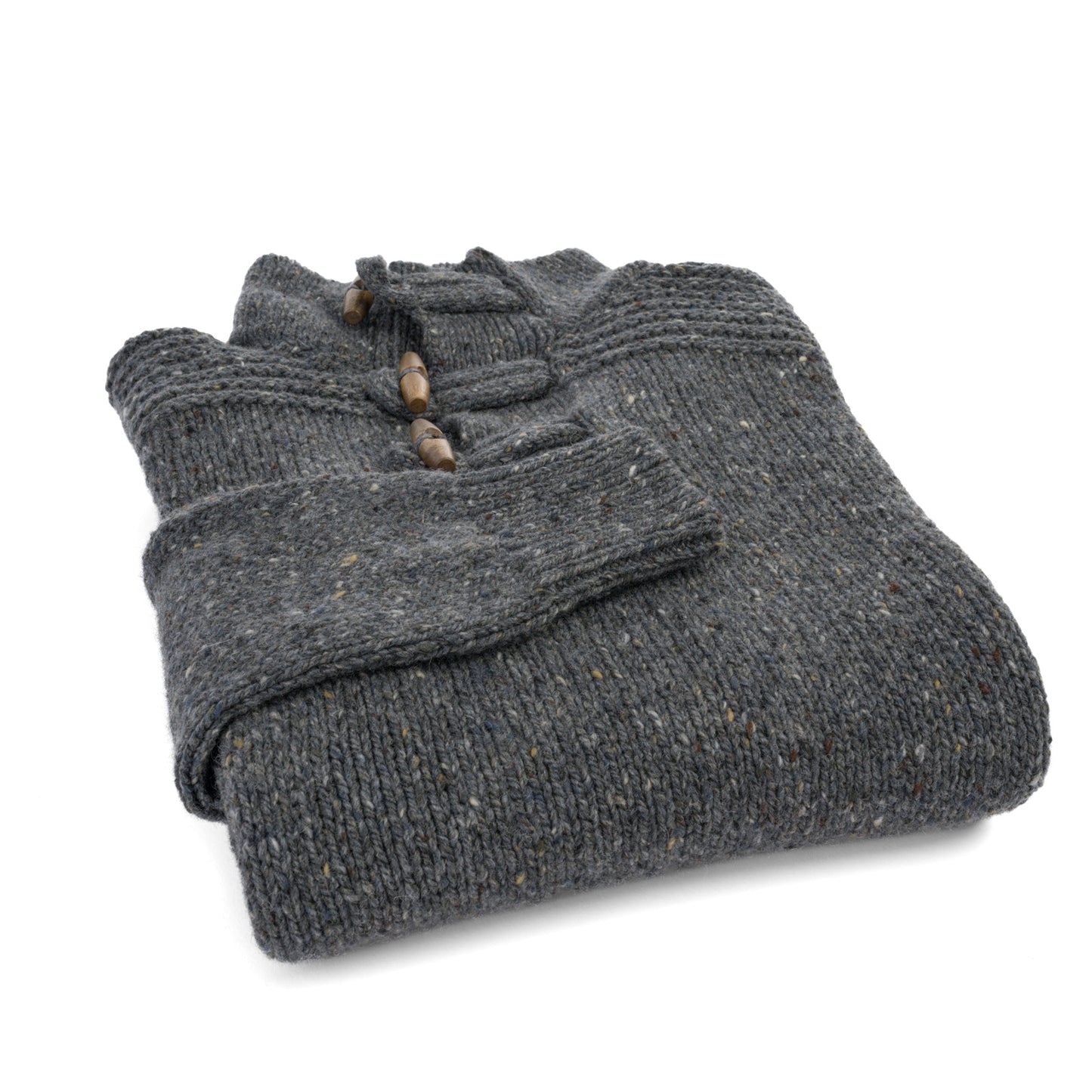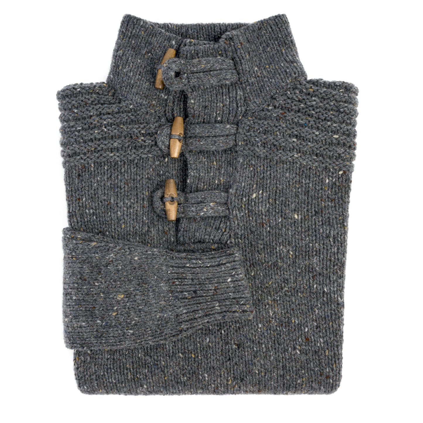 Donegal Pullover mit drei Knebelknöpfen und einem hohen Kragen. Urbaner Herrenstrick mit Knebelknöpfen aus Holz zum Schließen des Stehkragens. Aus weicher Donegal Fleck Merino Wolle gestrickt wirkt dieser Pullover interessant und lebendig. Vielseitig kombinierbar.