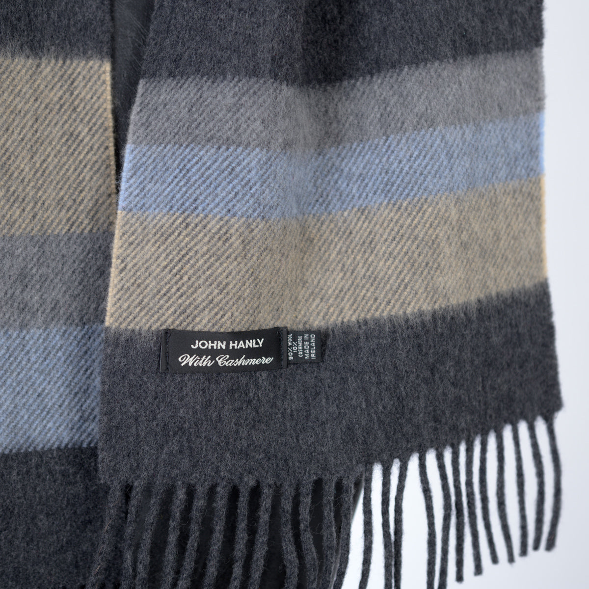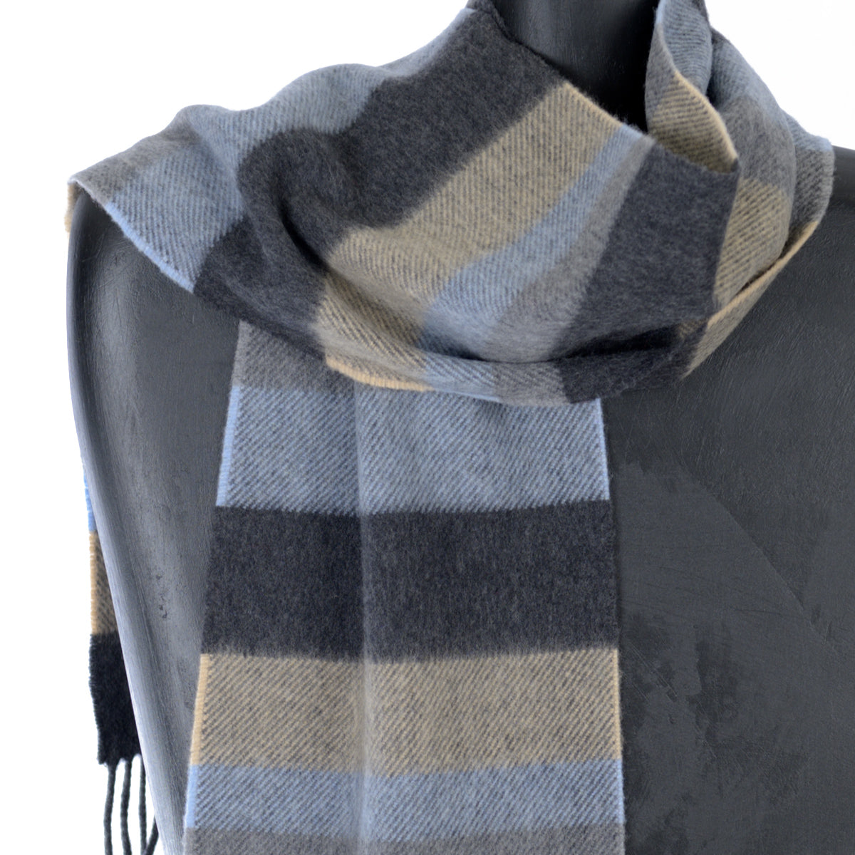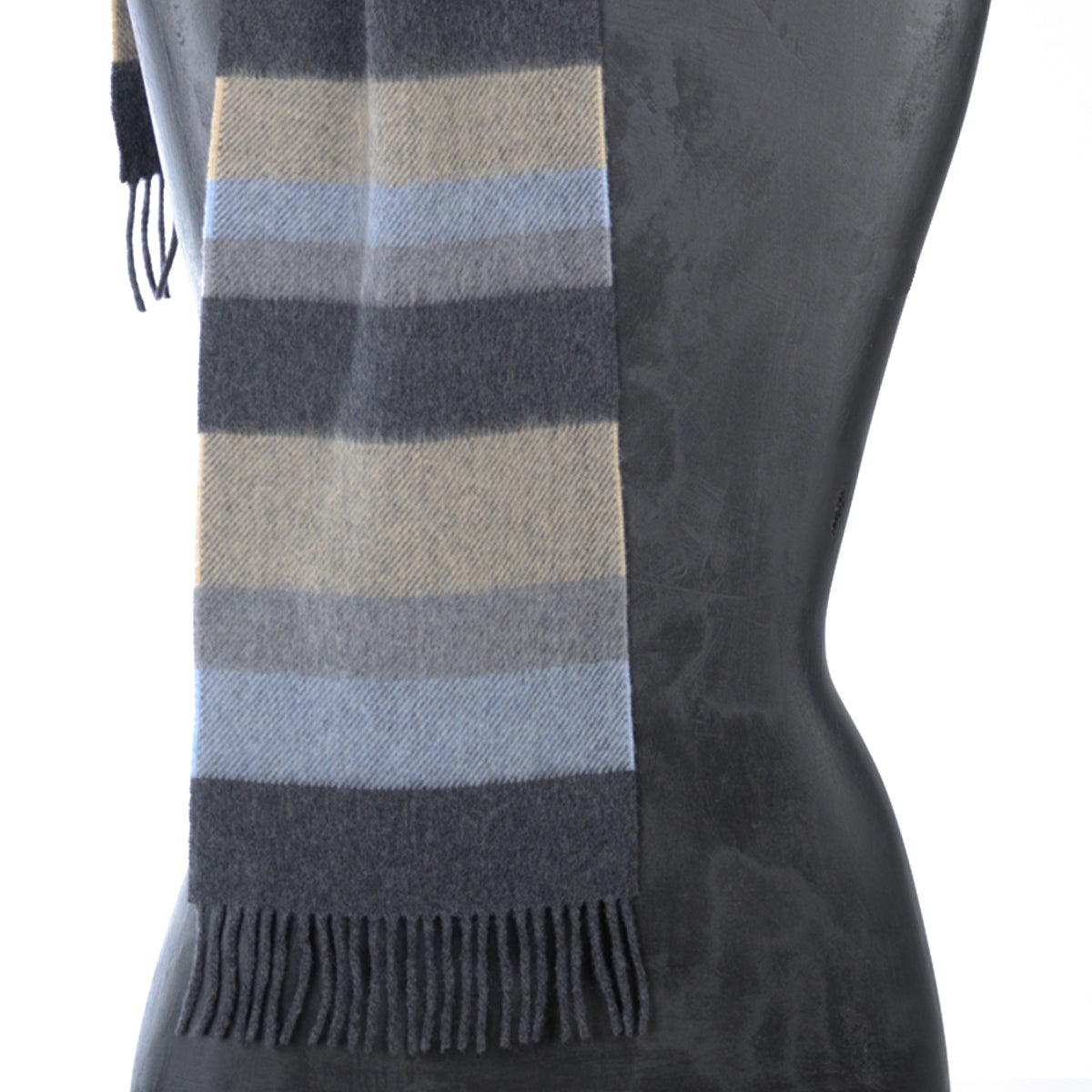 Das klassische Streifenmuster in Blau, Grau und Beige macht den Schal zu einem vielseitigen Begleiter – perfekt für Business, Freizeit und stilvolle Winterlooks. Mit seiner großzügigen Länge lässt er sich flexibel binden und tragen.