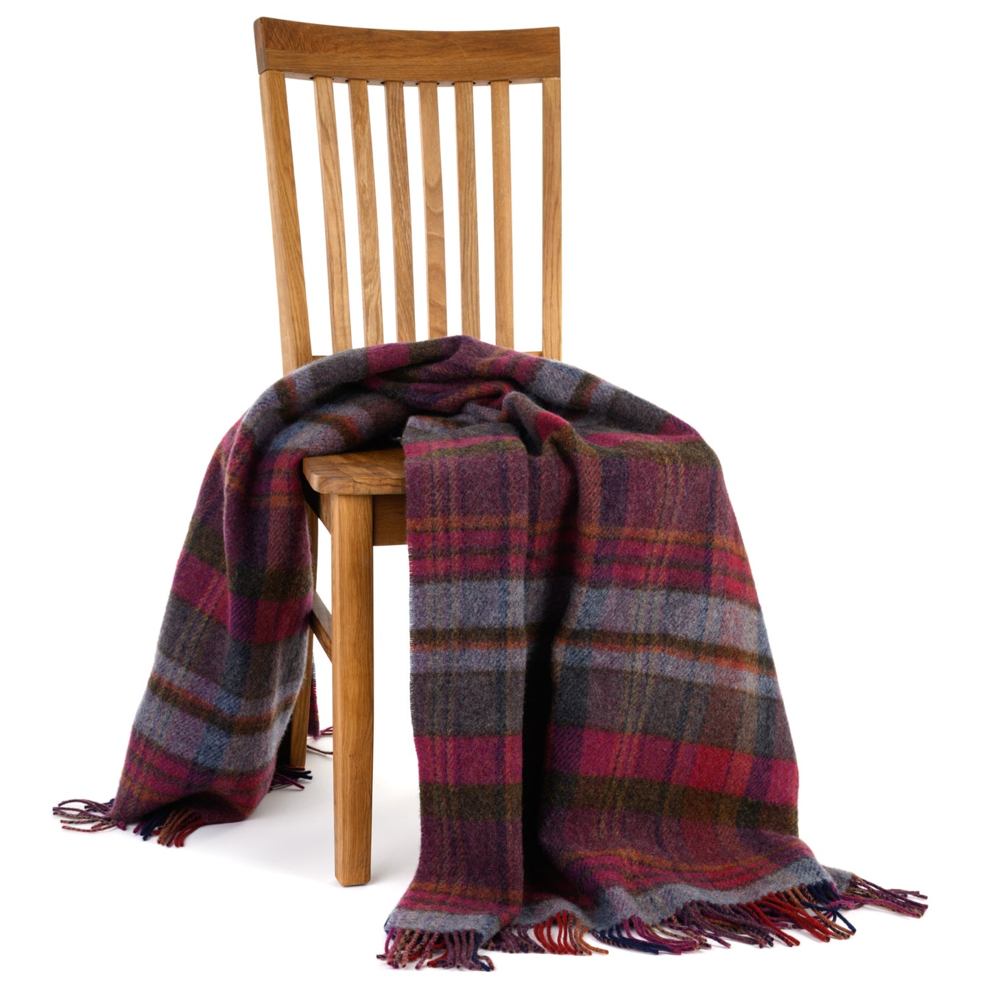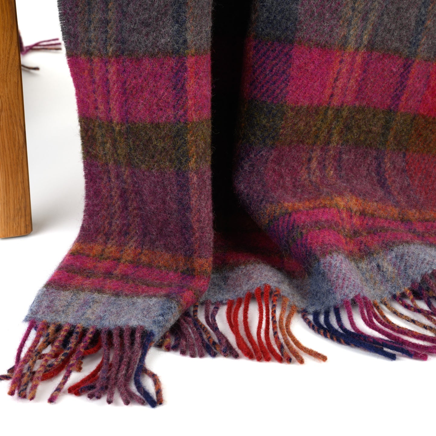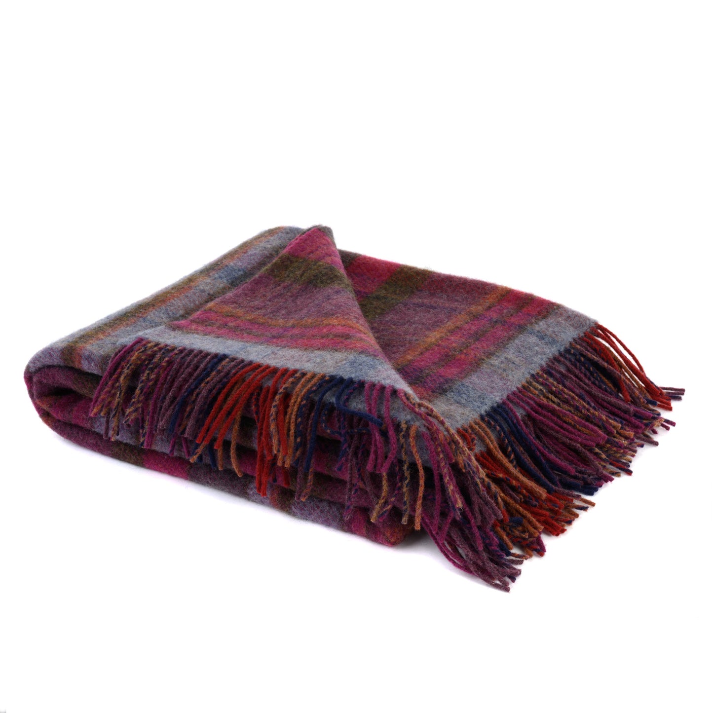 Eine wunderschöne, warme und robuste Wolldecke aus reiner Schurwolle in schönen Lila -Tönen, die Wärme und Gemütlichkeit ausstrahlen! Sie ist langlebig, robust und vielseitig einsetzbar, z.B. für einen Picknickausflug oder einen gemütlichen Abend vor dem Kamin. An zwei Seiten mit Fransen abschließend. In der traditionellen, irischen Weberei „John Hanly“ gefertigt.