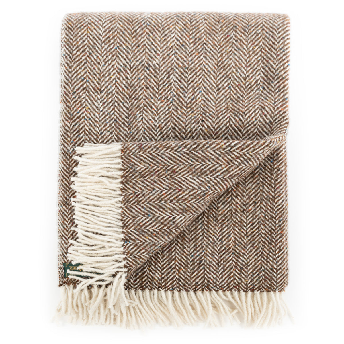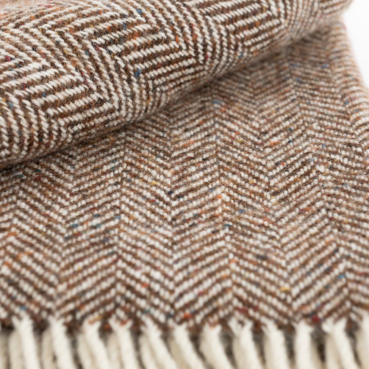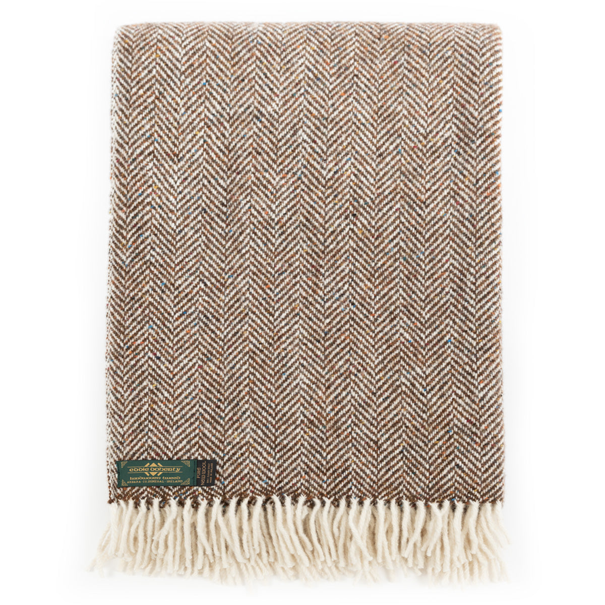 Diese schöne Wolldecke ist aus der typisch irischen „Donegal Fleck-Wolle“ gewebt. „Donegal Fleck“, so nennt man die Wolle mit den in Irland zusätzlich zum Grundton eingesponnenen Farbtupfern. In dieser braunen Decke finden sich orange, rote und blaue Sprenkel wieder. Diese robuste Decke ist von Eddie Doherty von Hand gewebt, deshalb ist sie nur in begrenzter Stückzahl verfügbar. In dem kleinen Dorf Ardara, das an der Nord-Westküste Irlands liegt, wird das Weber-Handwerk von Eddie Doherty, einem der letzten Handweber Irlands fortgeführt. Er webt seit Jahrzehnten Decken und Tweedstoffe in vielen Designs und Farben.